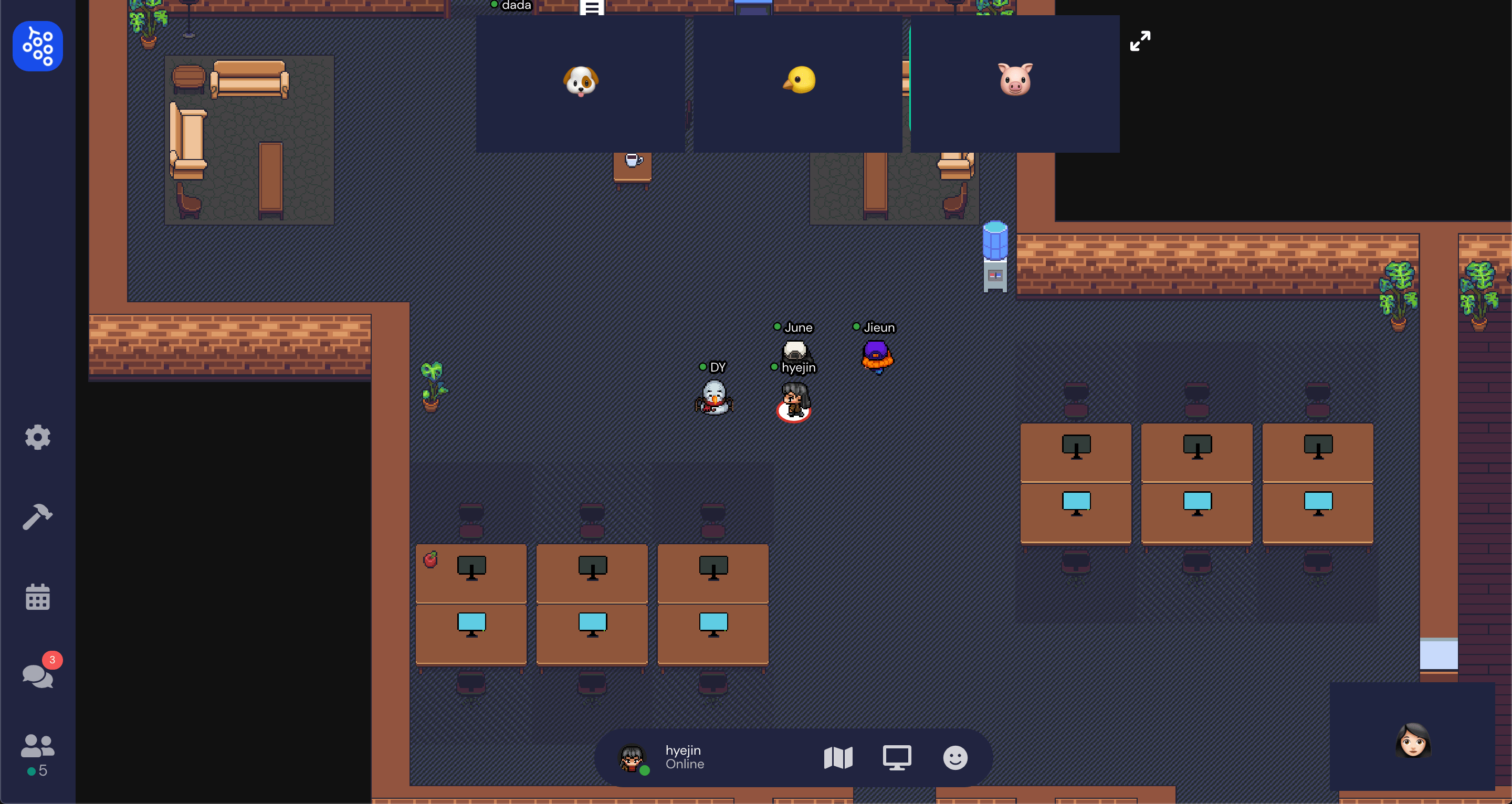 먼저 누군가 방을 만들어서 링크를 보내주면 다들 들어올 수 있다. 아마 방을 개설할 때 여러 가지 설정이 가능할 것 같은데 아직 그것까진 안 해봐서 모르겠다. 들어가면 이렇게 가상의 공간에 내 캐릭터가 보이고 오른쪽 하단에는 카메라에 비친 내 모습이 뜬다. 이렇게 아기자기한 그래픽을 가진 공간에서 게임처럼 방향키로 내 캐릭터도 움직일 수 있다.