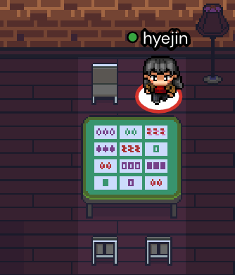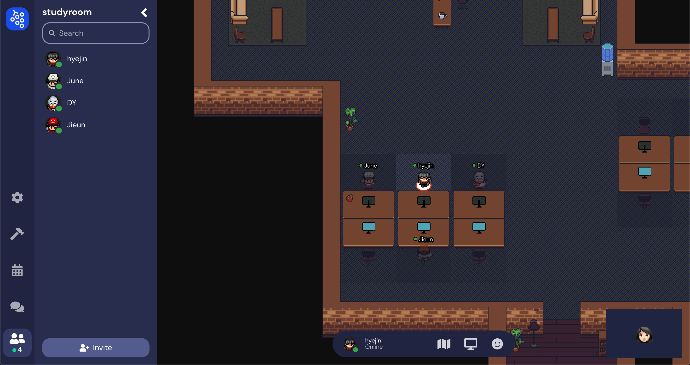 걸어서 독서실 같은 곳에 안착! 저기 들어가면 프라이빗 스페이스에 들어왔다고 뜬다. 보통 캐릭터들이 저 정도로 가까이에 있으면 카메라와 마이크가 켜지는데 프라이빗 스페이스에서는 저렇게 가까이 있어도 안 뜬다. 줌은 항상 카메라가 켜져 있으니 켜놓고 작업하기 부담스러울 수 있는데 Gather에서는 이렇게 혼자 작업하다가 피드백을 주거나 할 말이 있으면 상대방 근처로 가면 되니까 너무 편하다. 화면 공유도 되고 채팅도 있고 필요한 기능도 다 있다.