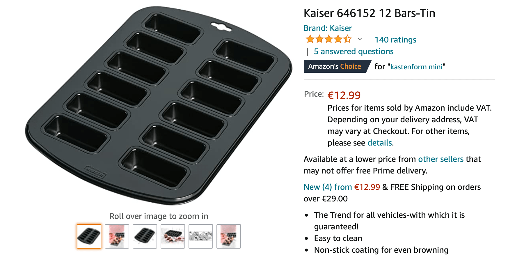 마들렌과 달리 휘낭시에는 선택지가 별로 없었다. Bar Mold라고 검색하면 좀 나오긴 하는데 그나마도 실리콘이 대부분이다. 그래서 얼마 안 되는 휘낭시에 틀 중에 가격도 괜찮고 후기도 괜찮은 걸로 골랐다. 살 땐 확인을 안 해서 몰랐는데 받고 나니 Kaiser 제품이었다. 베이킹을 한다면 한 번쯤은 봤을 브랜드로 다른 브랜드에 비해 조금 비싸지만 퀄리티가 좋다.