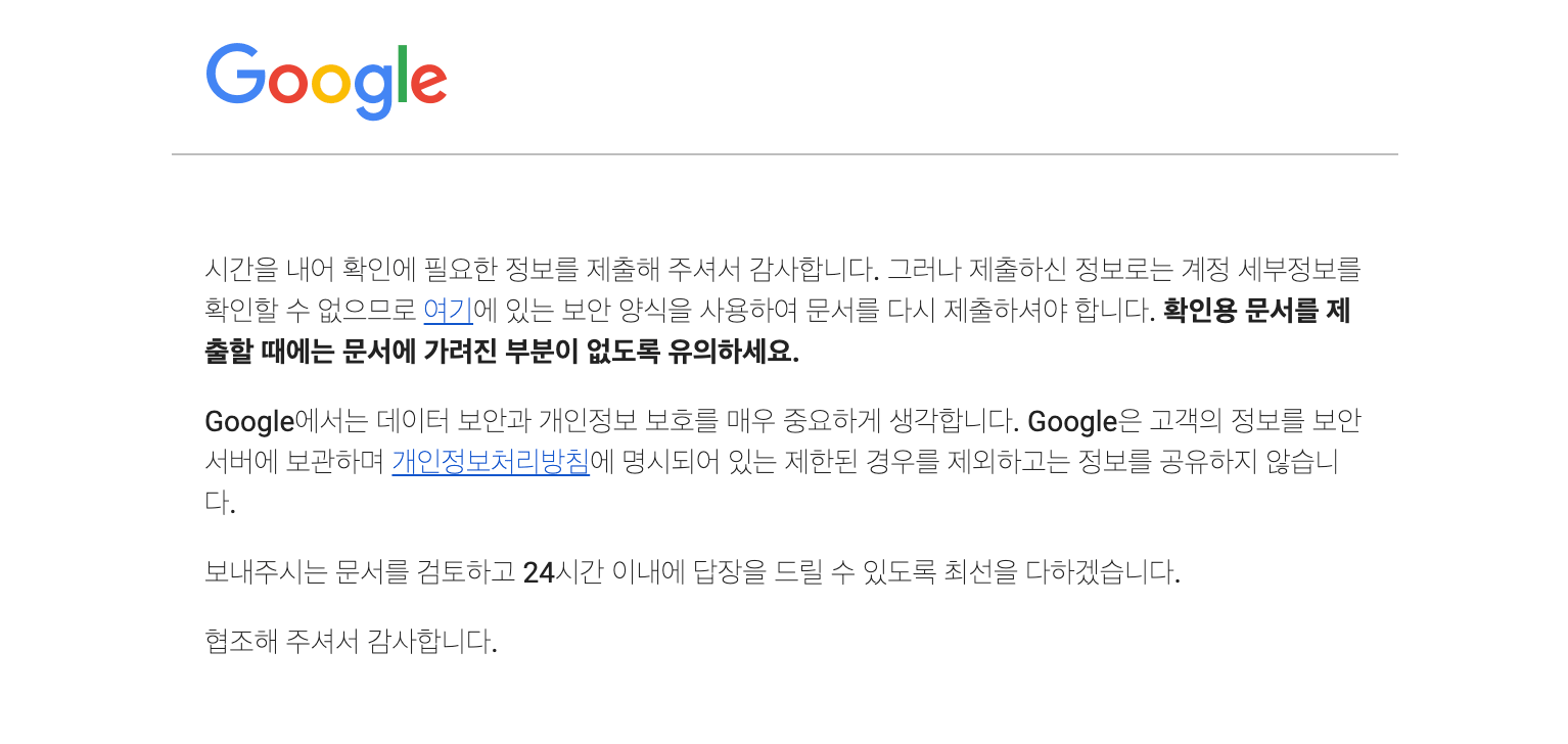 결과는 드디어 성공~~~!!!!! 메일을 받고도 얼떨떨했다. 이렇게 쉽게 될 거였다니 😭여권 번호 마스킹을 제대로 안 해서 그런 거였나 보다. 애드센스 결제가 막힌 걸 찾아보니 죄다 주소에 PIN 인증 글만 나와서 어떻게 할지 몰랐는데 겨우 해결했다. 아니 등록한 주소로 PIN 인증도 했는데 왜 또 신원 확인을 해야 하는 건지 모르겠지만 어쨌든 계정이 다시 활성화가 되어서 다행이다. 구글 결제 죄다 막혀가지고 이때까지 결제했던 영화는 어쩌며 또 구글 드라이브에 있는 파일들은 어쩌지 싶었는데 다행이다.