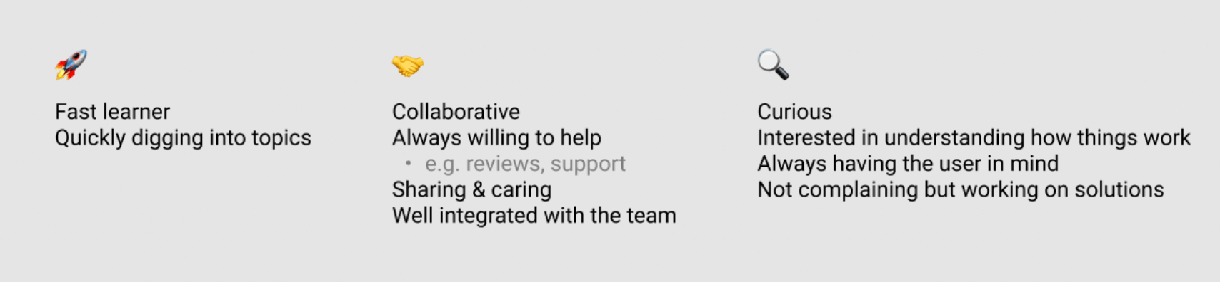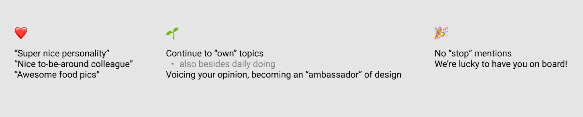 첫 번째 피드백은 전에 회사에서도 정말 똑같이 받았던 피드백이다. 뭐든지 빨리 배우고 어떻게 해야 할지 고민을 하지 않고 바로 시작한다고. 나는 딱히 그런 걸 모르겠는데 다들 이렇게 일 하지 않나?! 😂 걱정했는데 팀원들이랑 합도 잘 맞는 거 같다고 느끼나 보다. 잘됐다 잘됐어. 세 번째는 정말 모르는 게 많아서 궁금할 때마다 계속 물어봤는데 그래서 이런 피드백을 남겨준 게 아닐까 싶다. 그리고 가장 놀랐던 'Always having the user in mind' 정말로?!?! 👀 내가?!?!?! 노력하고 있지만 어렵다고 생각하는 부분이라서 이런 피드백을 받으니 너무 신기했다.