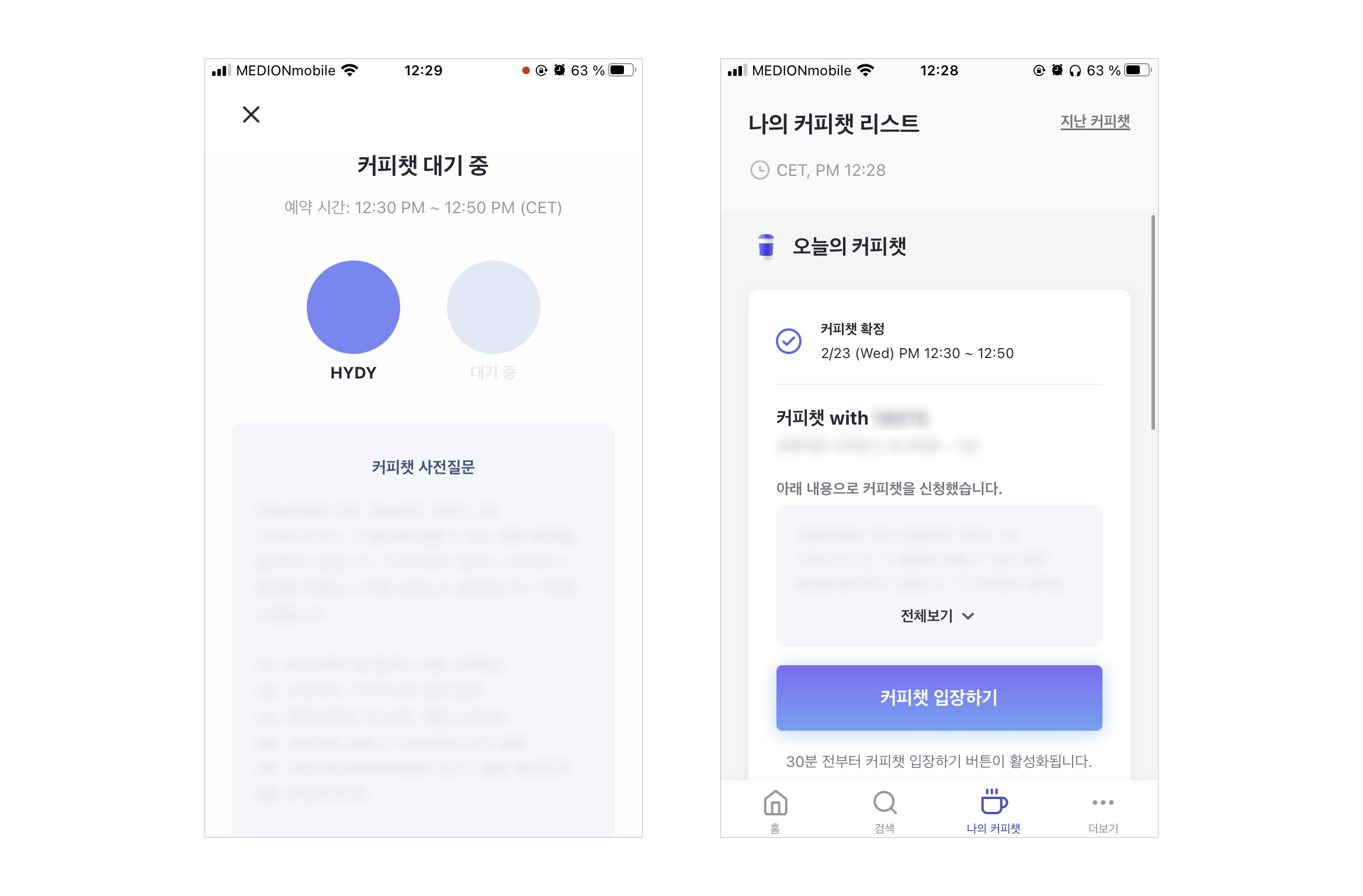현재 커피챗은 컴퓨터로는 안되고 휴대폰 앱으로만 서비스를 지원하고 있다. 그래서 어플을 설치하고 준비를 했는데 당일 이렇게 뜨더라. 두근두근 무슨 말을 하면 좋을까 긴장도 되면서 첫 커피챗이라 어떨지 궁금하기도 했다. 딱 12시 30분이 되자 들어오셨는데 몇 번 해보신 건지 너무 반갑게 맞이해주셔서 나도 긴장이 확 풀렸다. 커피챗에서 쟁쟁한 다른 사람들을 중에서도 이렇게 나를 찾아서 신청을 해주신 것도 너무 신기했고 이렇게 이야기를 한다는 게 너무 재밌었다. 해외에 취업해있는 한국 사람들 많던데 다들 많이 등록해서 나도 이직할 때 이용할 수 있으면 좋겠다.
