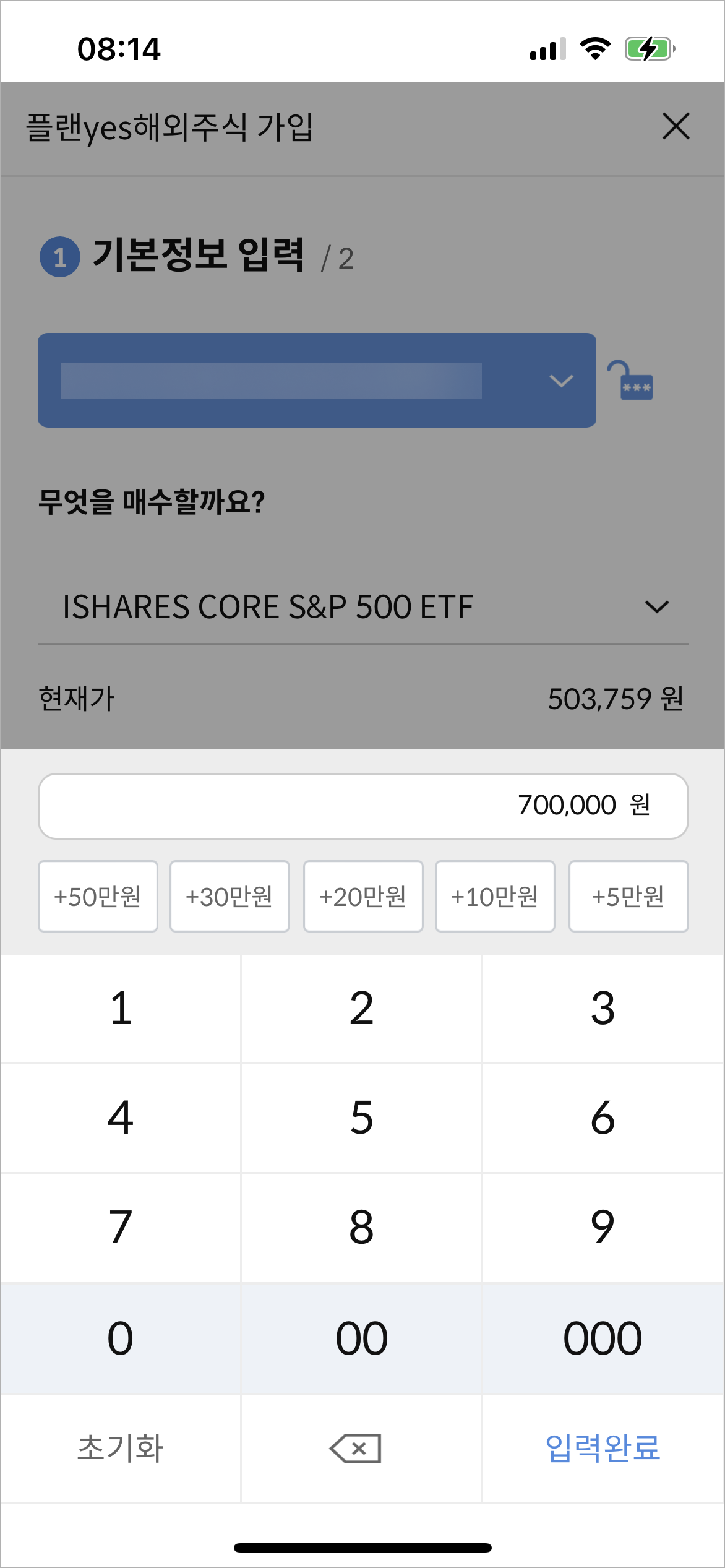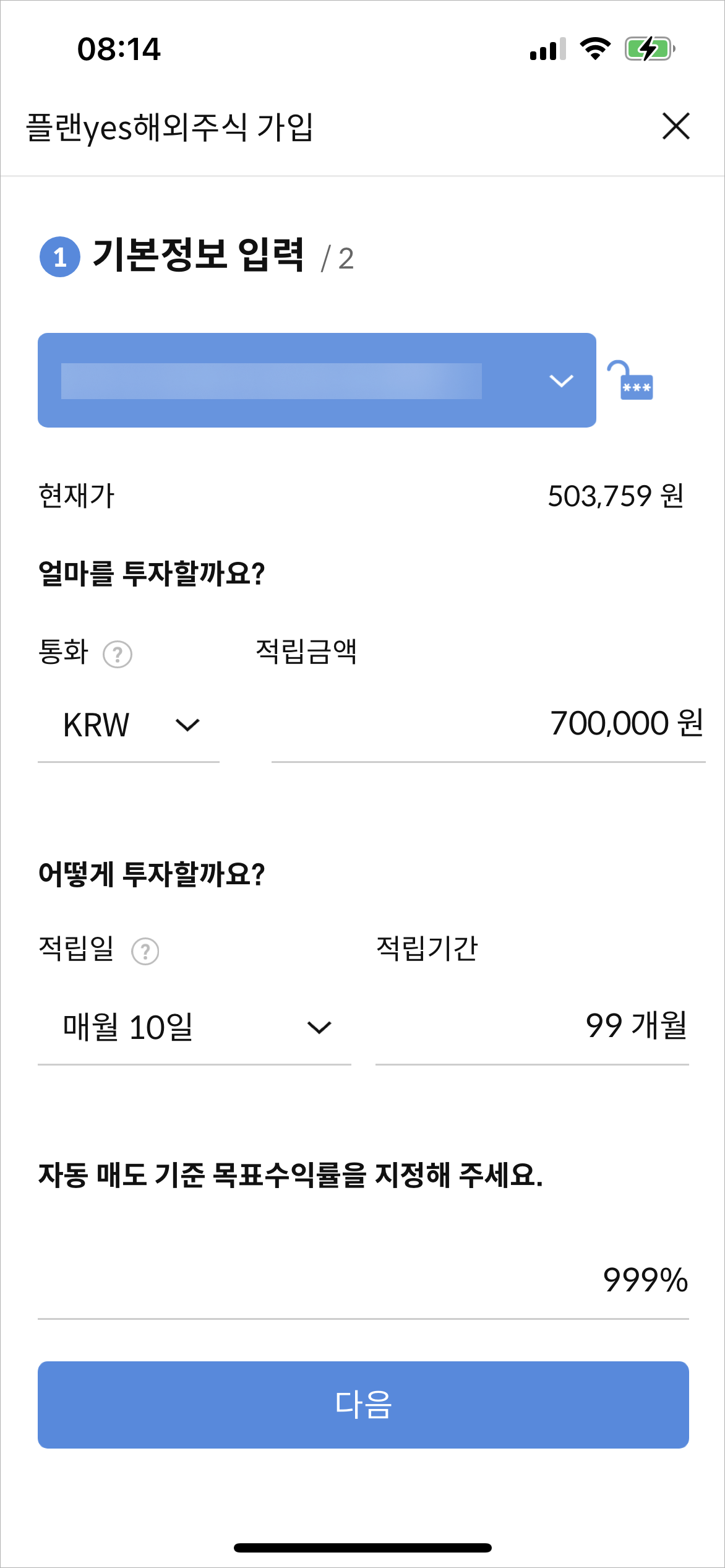 매수할 종목을 선택했으면 이제 매월 얼마 투자할지를 기입한다. IVV의 경우 현재가가 50만 원 언저리였는데 조금 올라도 안전빵으로 구매를 할 수 있도록 70만 원을 넣었다.