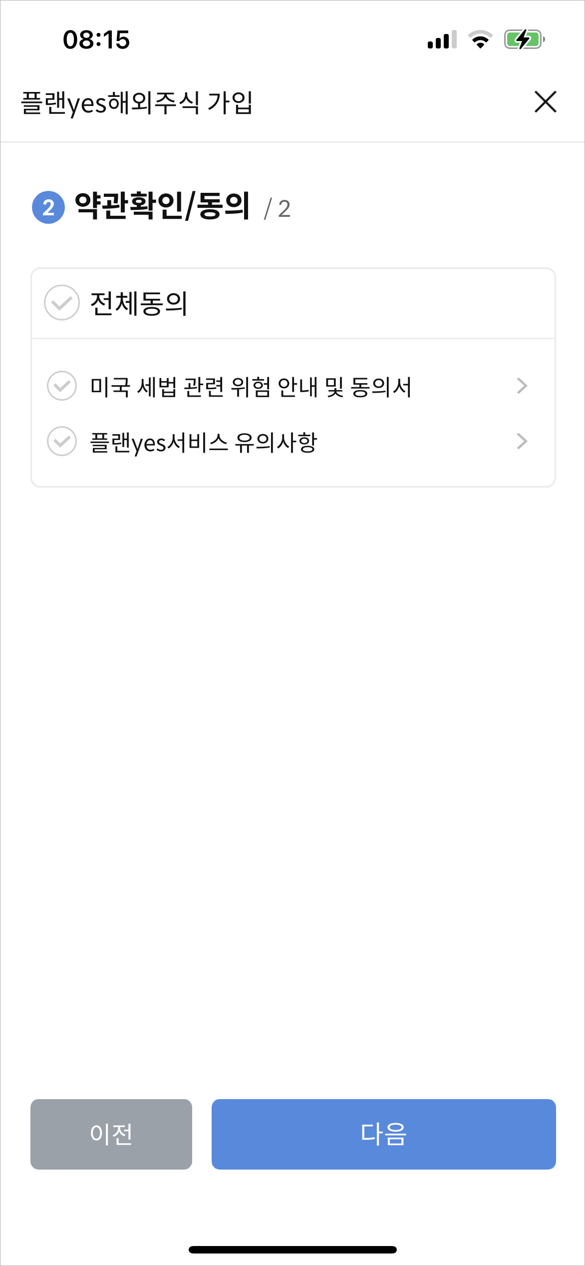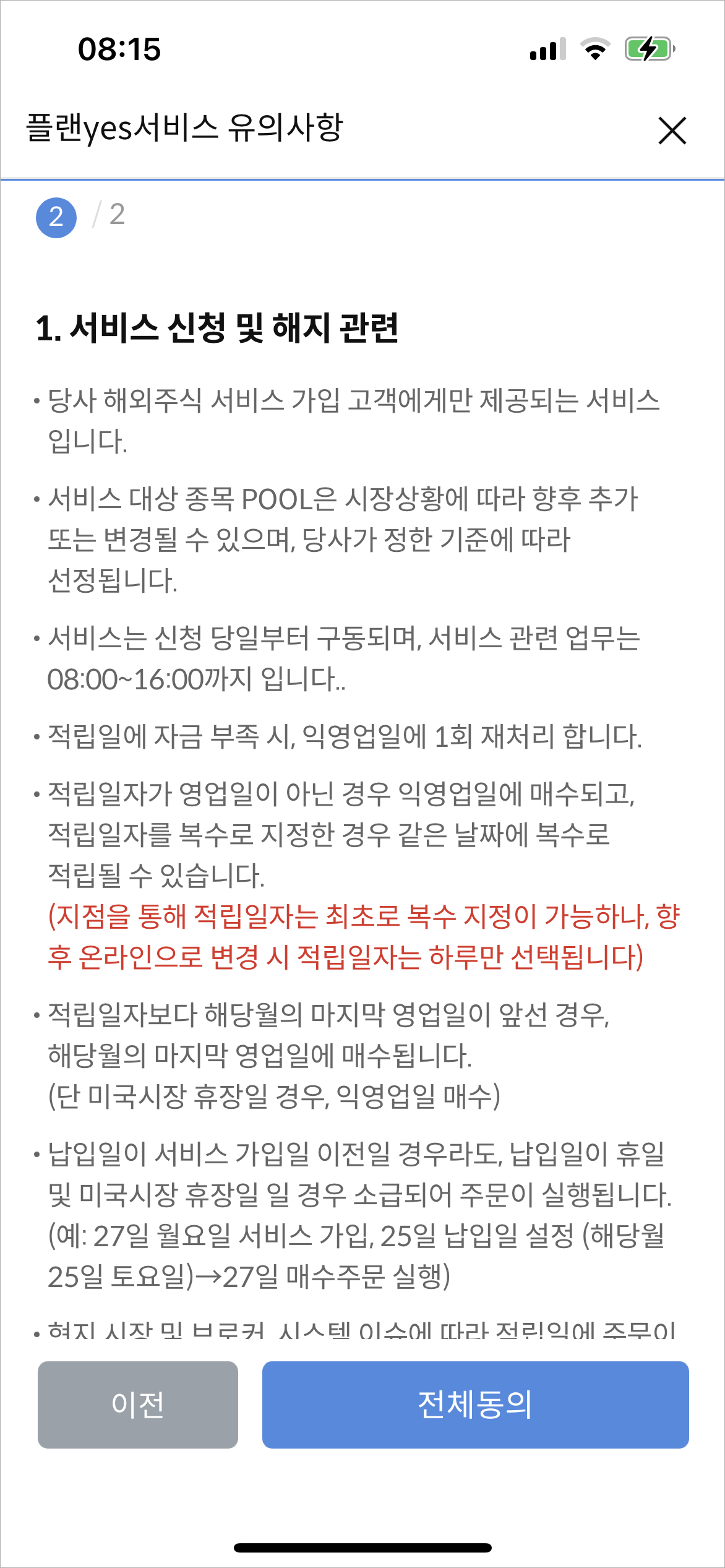 금액, 종목, 기간, 목표수익률을 설정하고 다음 버튼을 누르면 약관 페이지가 나온다.