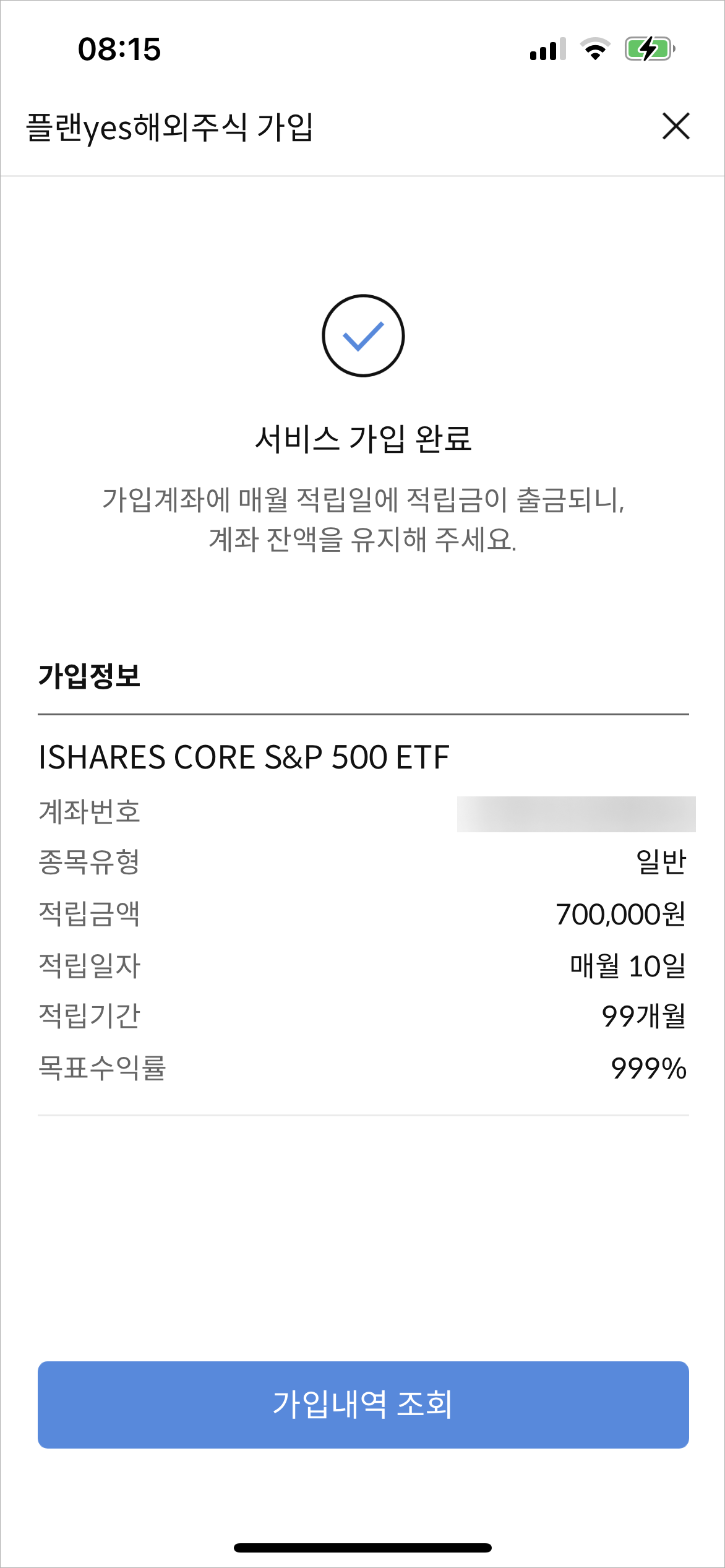 적립기간과 목표수익률을 적어준다. 설정했던 목표수익률에 달성하면 자동으로 매도를 해버리기 때문에 적립식으로 계속해서 ETF를 구매하고 싶다면 최대치인 999%를 적어준다.