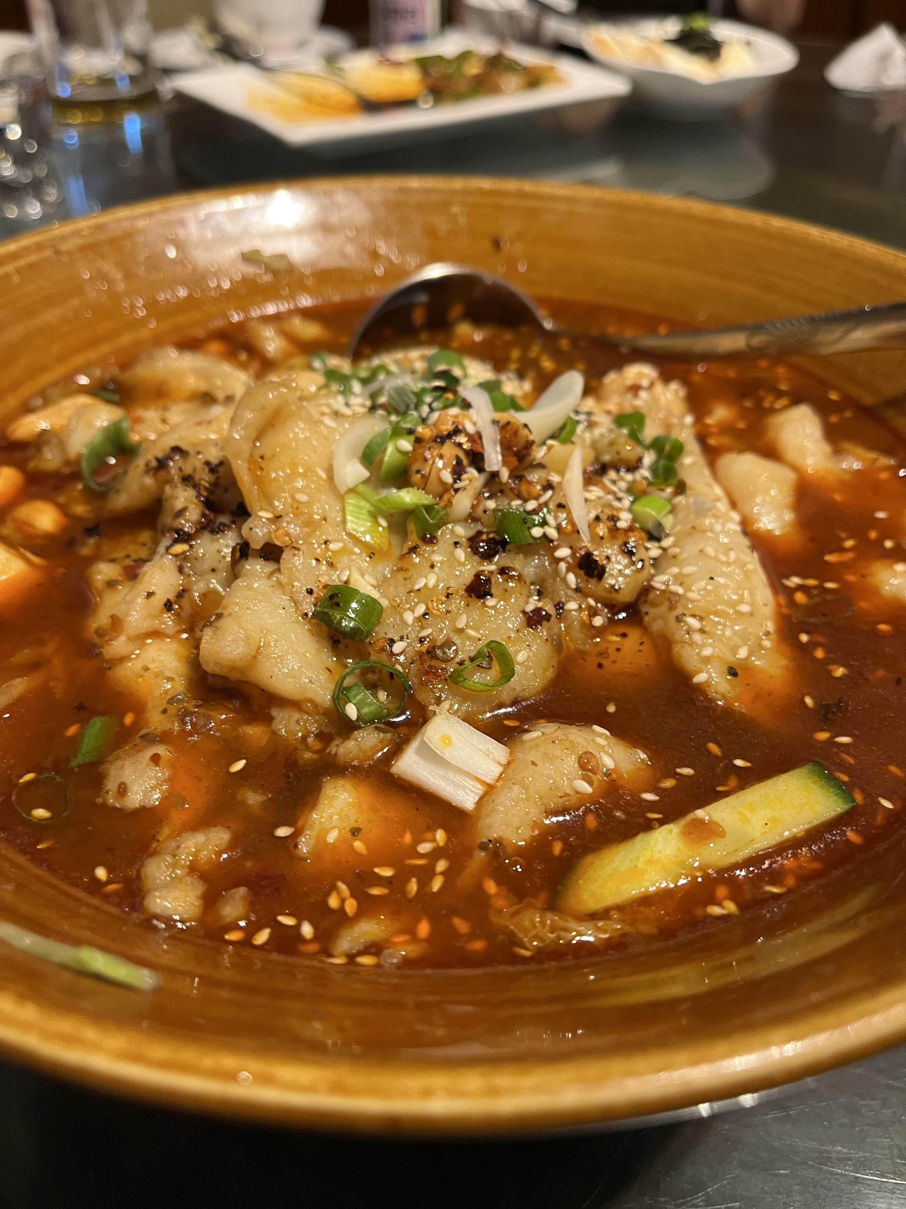 앞전에 나온 생선국에서 마라가 들어간 매콤한 버전. 일반 버전보다 매콤한 버전이 훨씬 더 맛있다. 생선살도 탱글탱글하다.