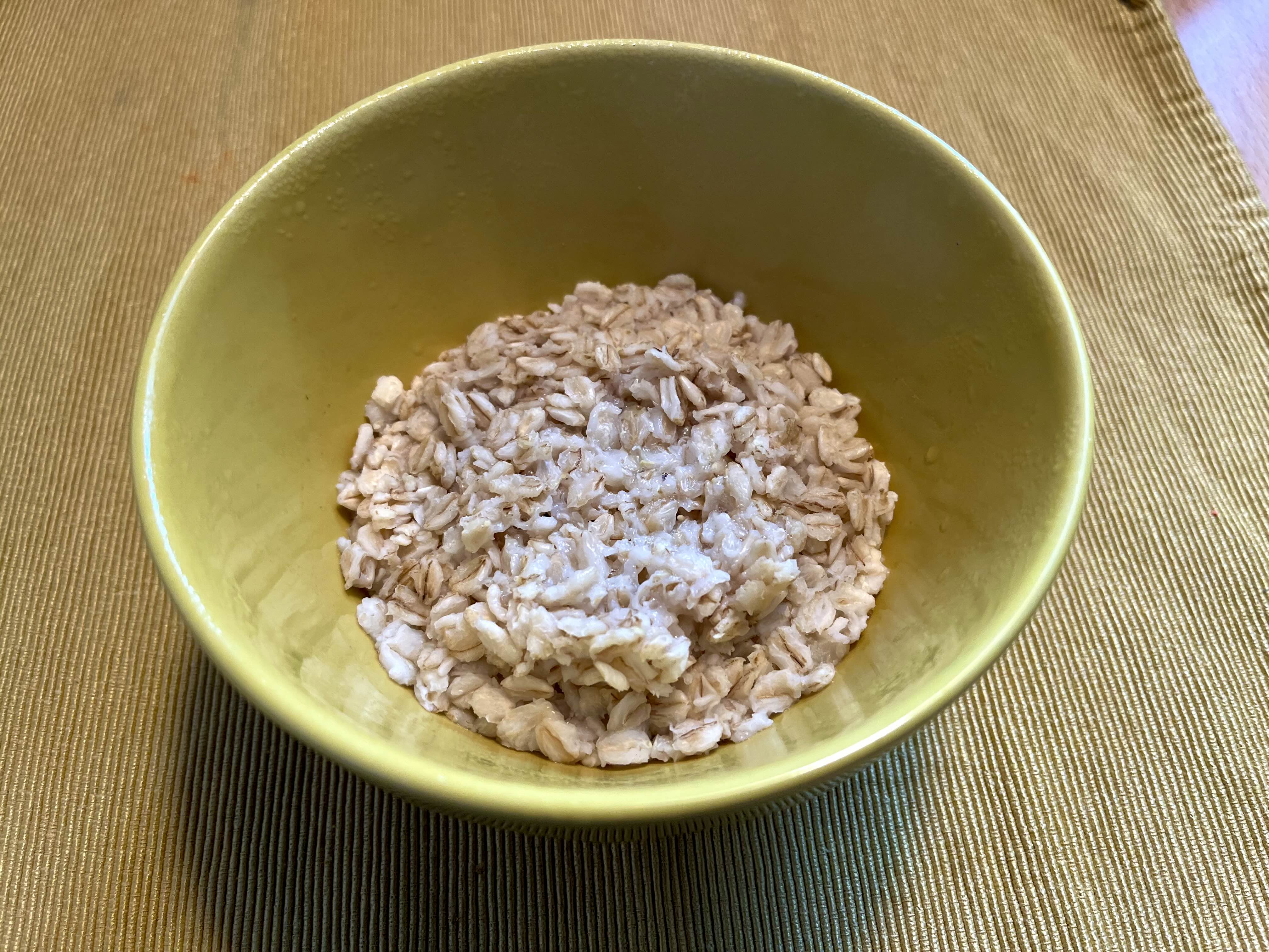 한 끼 오트밀 40g. 전기 포트에 물을 끓여서 오트밀 위로 0.5cm 정도 물이 올라올 때까지 부어준다. 그리고 다른 재료들을 준비하고 다시 보면 오트밀이 다 뿔어서 물이 안 보인다. 그러면 전자레인지에 한 2분 돌려준다.