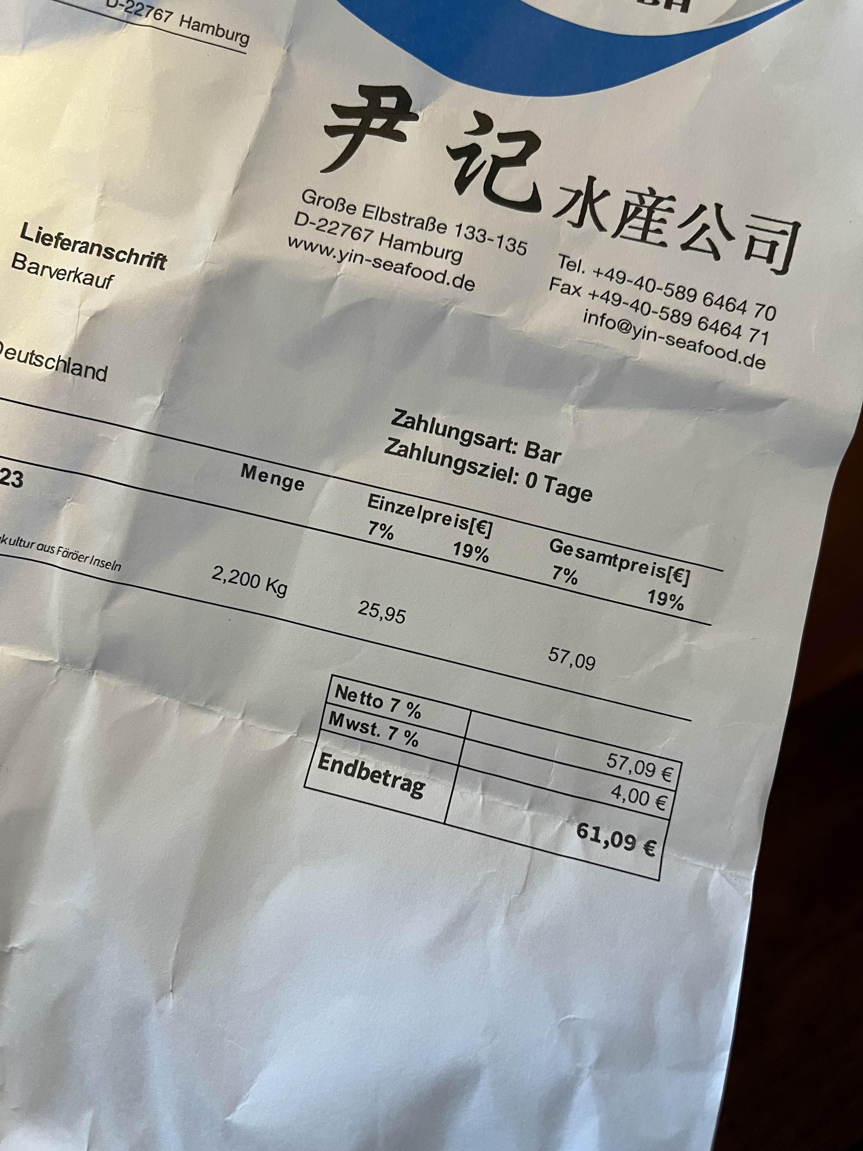 최근 친구 집에 초대를 받았는데 연어가 진짜 대박이었다. 퀄리티도 너무 괜찮고 입에서 녹는 눈물 줄줄 감동 실화의 맛. 회가 흔한 한국이라면 모르겠지만 독일에서 이 정도 퀄리티의 회를 이렇게 마음껏 먹을 수 있다니. 눈물이 앞을 가리는 맛이었다. 너무 맛있어서 친구한테 어디서 샀냐고 했더니 Yin Seafood에서 샀다고 했다. 심지어 반마리에 40유로 아래로 샀다는 믿을 수 없는 이야기를 했다. 나도 종종 연어 요리를 했는데 대충 동네 해산물 가게에서 필렛 조금만 사도 20유로는 기본으로 넘기 때문에 그날만 무슨 특가 세일을 한 거 아닌가 싶을 정도로 믿기 어려웠다.
