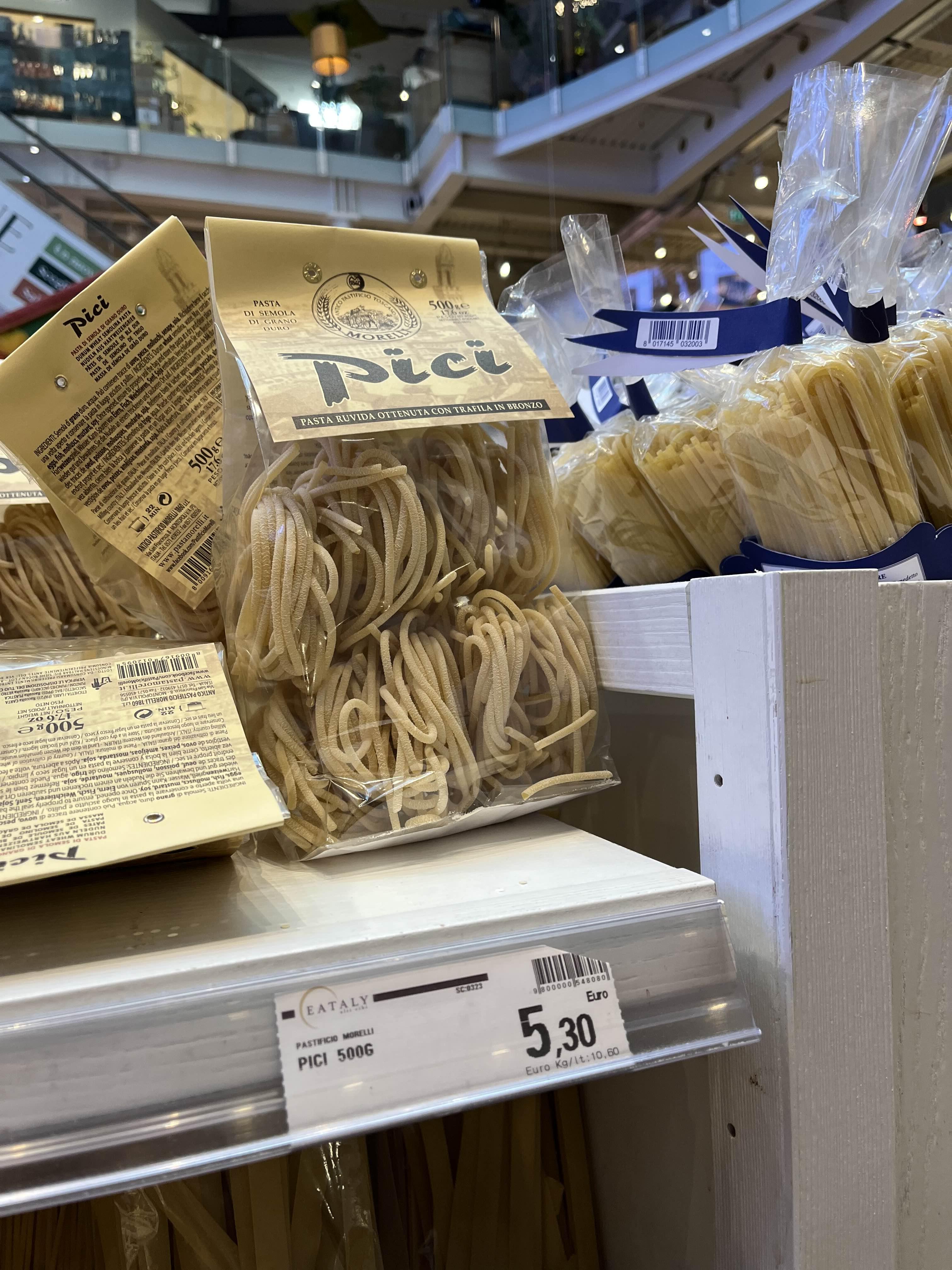제일 먼저 찾은 Pici 파스타!!! 독일 마트에서 한 번도 본 적이 없기 때문에 여기서 무조건 사가야한다고 한 봉지 담았다. 근데 무슨 파스타 한 봉지에 5유로나 해? 진짜 비싸다. 옆에 있던 다른 파스타들과 비교해도 Pici 파스타가 훨씬 더 비쌌다. 왜지? 그냥 두꺼운 스파게티자나!