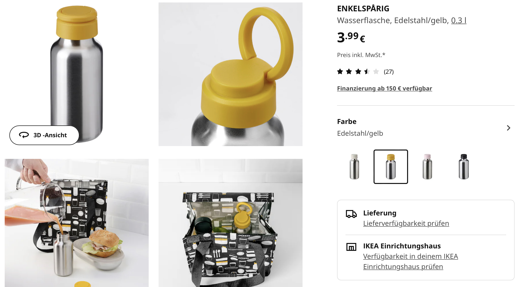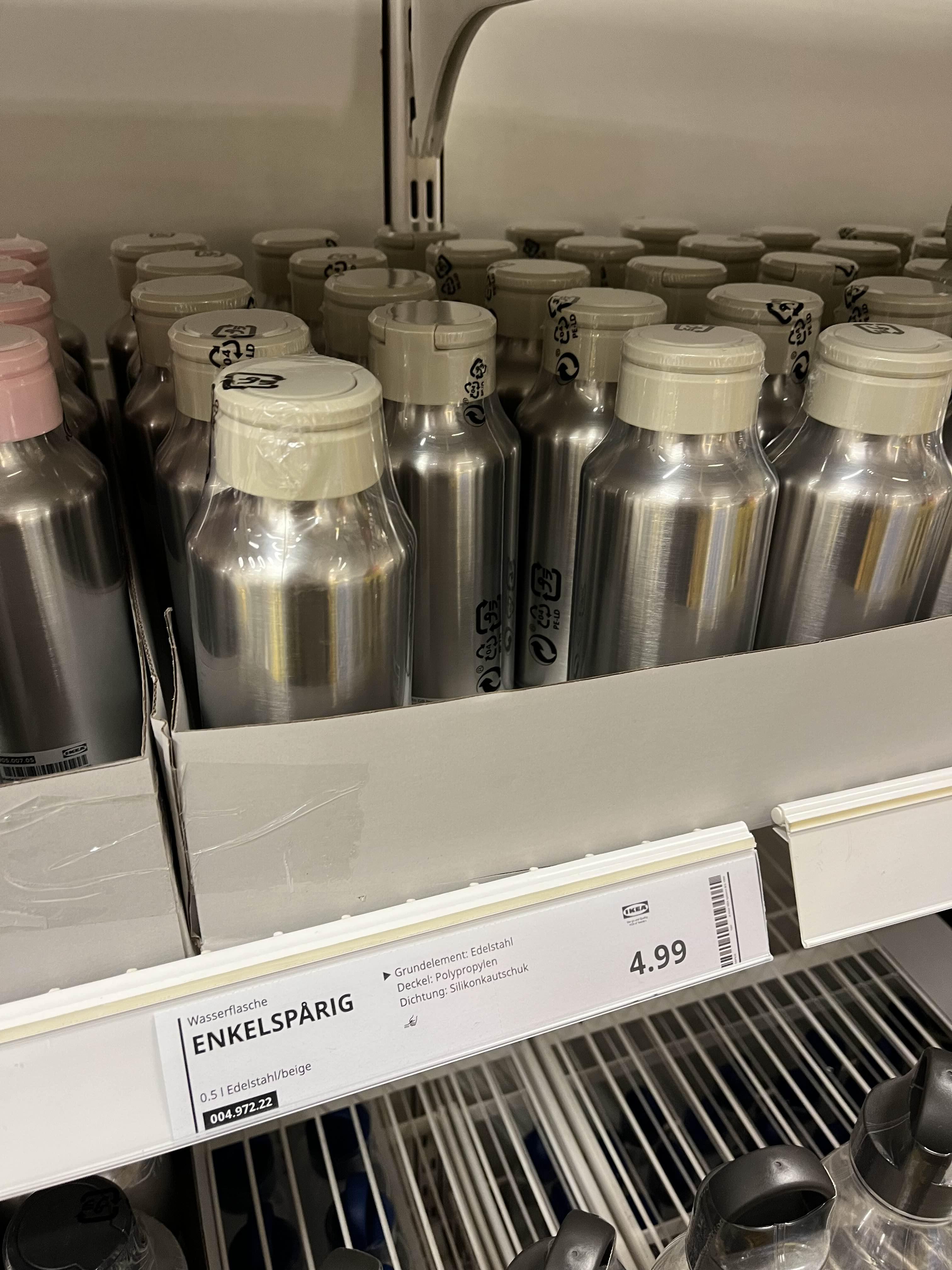 예전에는 이케아에 스테인리스 제품들이 별로 없었는데 오랜만에 오니까 스테인리스 컨테이터도 많고 이렇게 귀여운 물병도 있었다. 요즘 항상 물을 가지고 다니는데 물병을 가득 채워나가봤자 다 마시지도 못 하고 무겁기만 해서 작은건 없나 생각했었는데 300ml라니 딱이다. 집에 가져와서 이걸 샀다고 친구에게 보여주니 장난하냐고 한입거리라고 하긴 했지만 나한텐 딱이다. 귀여운 노란색 뚜껑도 너무 마음에 들어 💛 뚜껑에 고리가 달려있는데 이게 은근히 편하다. 사무실에도 한 번 가져갔는데 고리가 있어서 여기저기 돌아다닐 때 아주 유용했다.