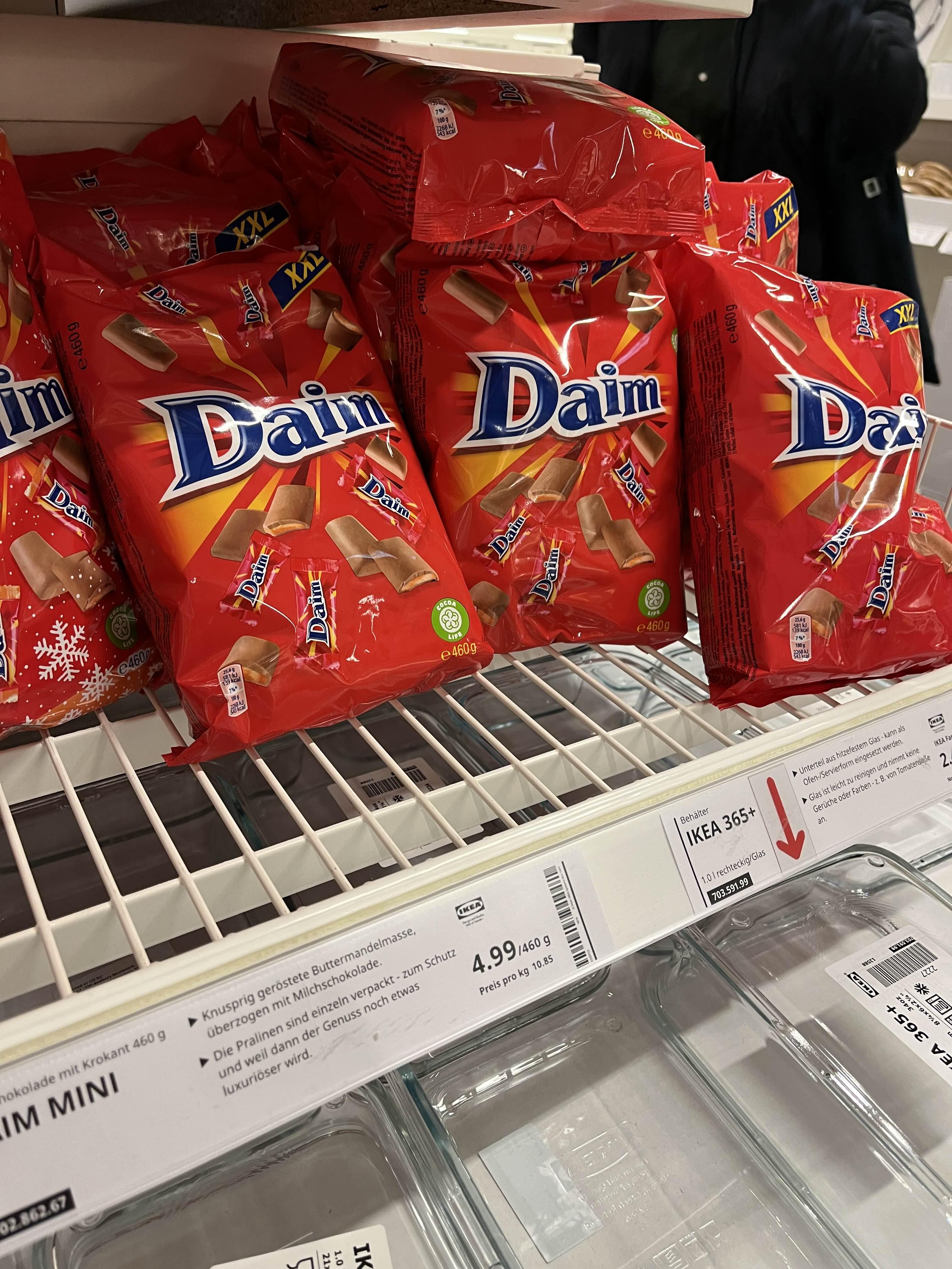 나왔다. 드디어 이케아에 온 이유❣️ 요즘 최애 간식이다. 딱딱한 카라멜에 초코렛이 입혀진건데 아주 중독적인 맛이다. 친구집에 갔는데 너무 맛있어서 어디서 샀냐고 물어봤더니 이케아에서 샀다고 하더라. 그렇다고 초코렛 사러 이케아 오기도 좀 그렇고 이케아 갈 일이 있을 때만을 기다렸는데 오늘이 그날이었다. 한 봉지는 나먹고 한 봉지는 한국 가져가려고 두 봉지나 샀다.