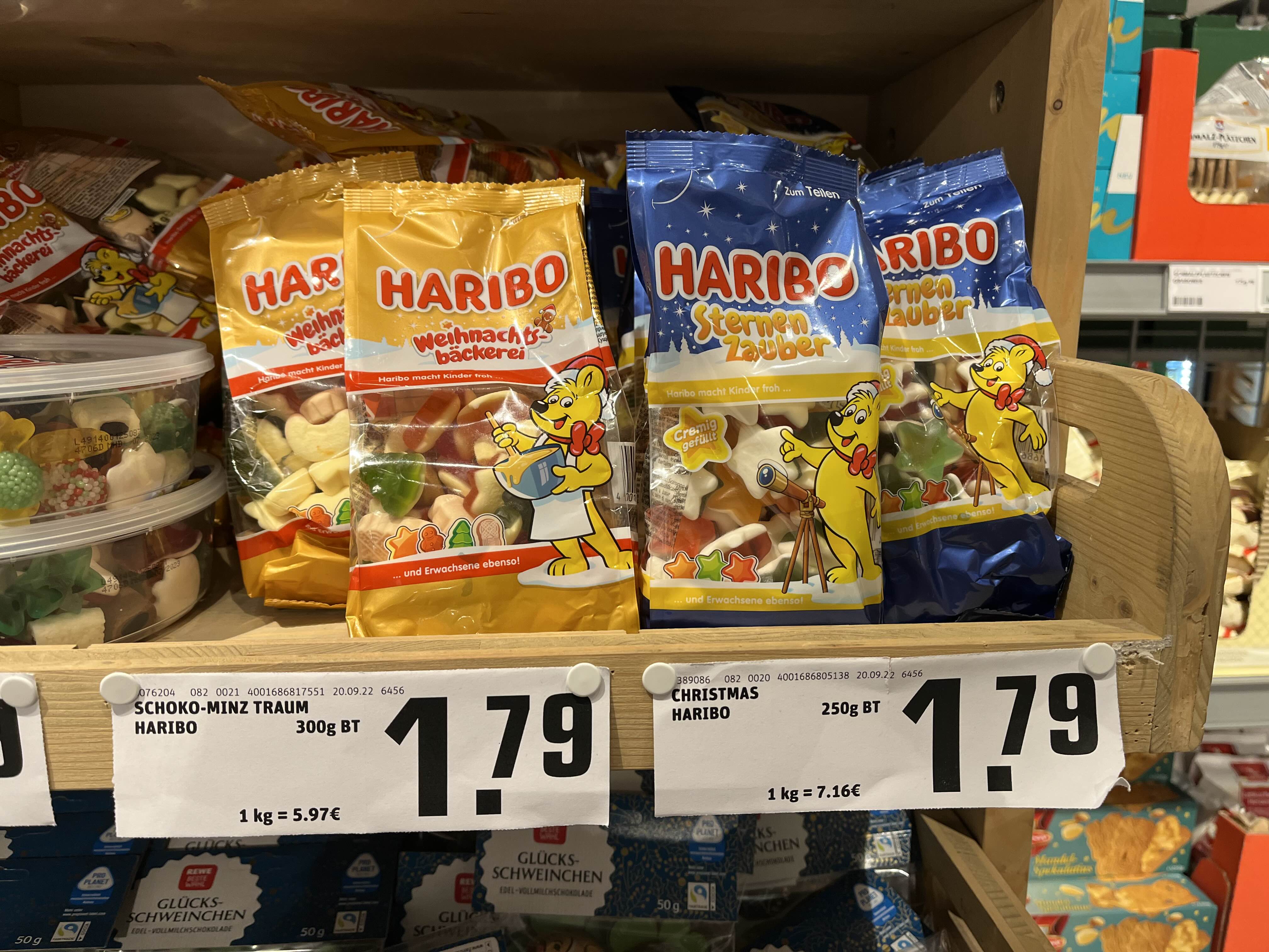 크리스마스 시즌이 되면 하리보에서도 이렇게 크리스마스 컨셉으로 젤리들이 나온다. 아예 통에 여러 가지 귀여운 모양으로 나온 것도 있고 별 모양 천사 모양으로 팩에 담겨있는 것도 있다. 젤리들이 귀여워서 반응이 좋았다. 플라스틱 통에 담겨있어서 대충 가져왔는데 캐리어 안에서 부서졌다. 내용물이 흐르진 않았는데 만약 선물할 거라면 한 번 뽁뽁이로 싸서 가져오는 게 좋겠다.