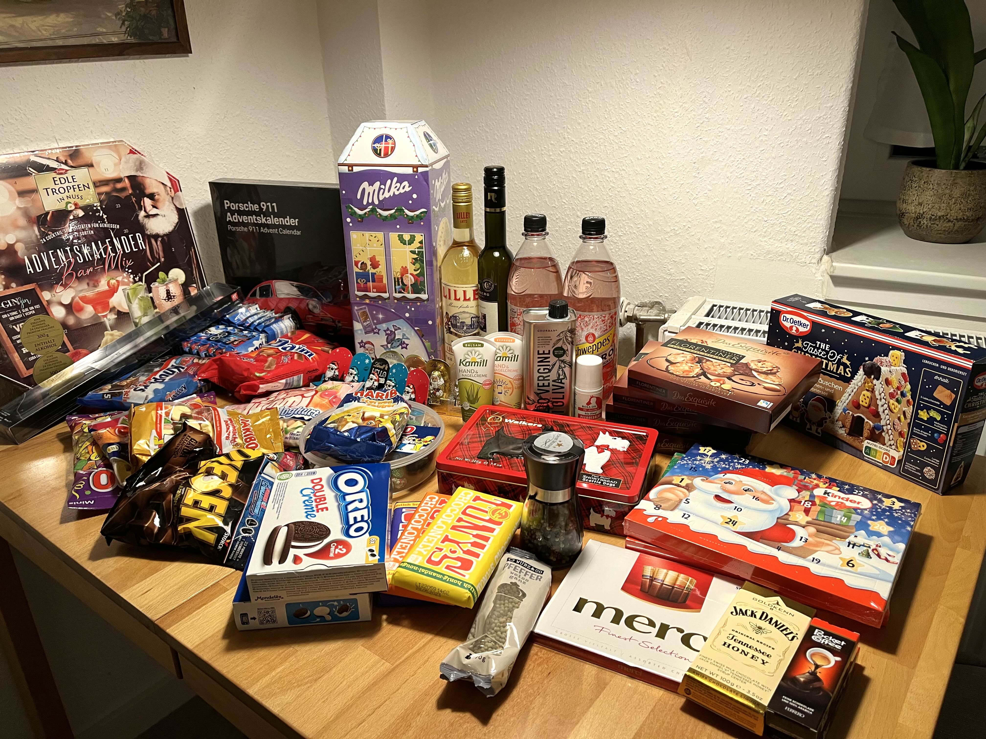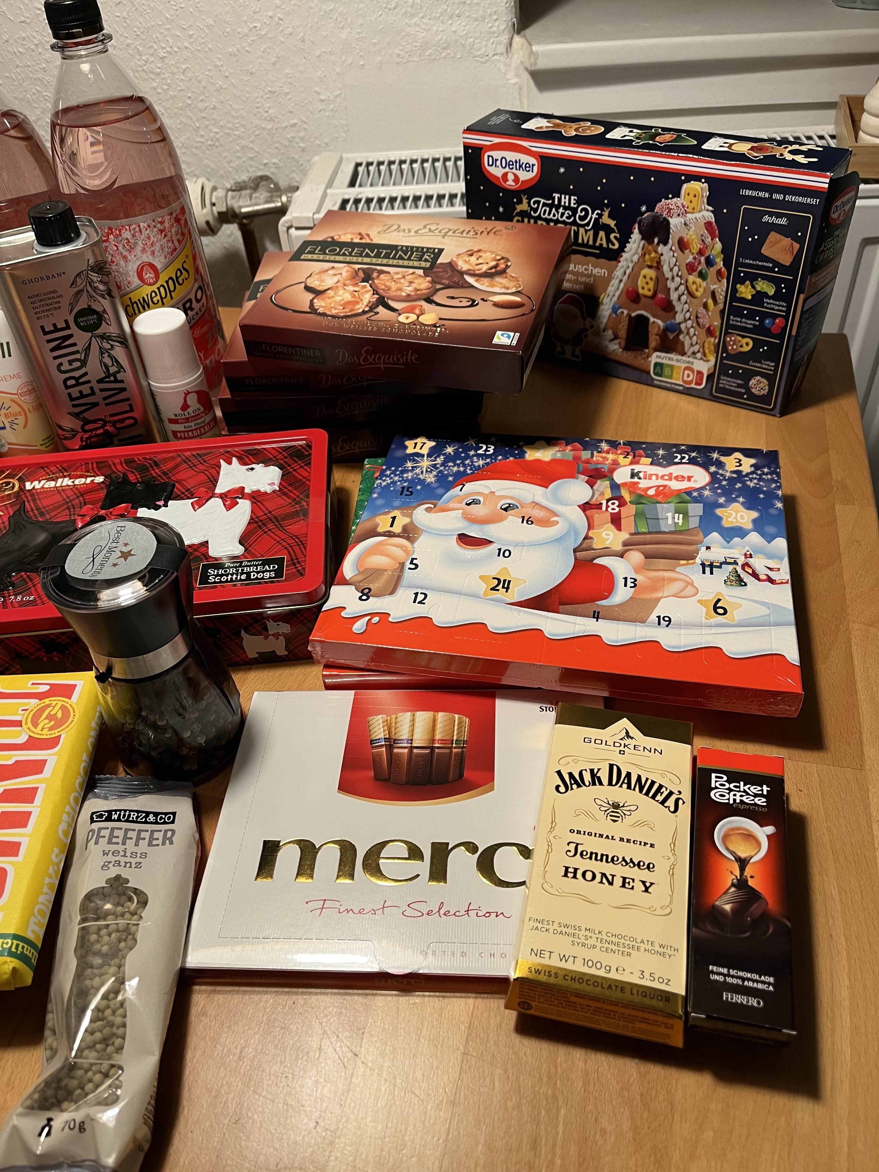 친구 줄 미니 어드벤트 캘린더도 사고 엄마는 초코렛에 뭐 들어있는 걸 좋아해서 잭다니엘이랑 커피가 들어있는 초코렛을 샀다. Merci는 여동생이 회사 사람들 나눠줄 거 하나 가져다 달라길래 가져갔는데 Merci 코스트코에 팔더만 ^^.. 맨 위에 네 개 쌓여있는 건 플로렌틴 쿠키인데 가족들이 너무 좋아해서 인당 한 박스씩 먹으라고 넉넉히 가져왔다. 이 맘 때쯤 코스트코에도 플로렌틴 쿠키 판다는데 그건 너무 대용량이고 이게 한 입씩 먹기 좋다. 그리고 가족들이 너무너무 좋아했던 Walkers 버터쿠키 박스!!! 강아지가 그려진 빨간색 통이다. 원래는 내가 Walkers Shortbread를 좋아해서 그걸 가져오려고 했는데 에데카에서 이렇게 예쁜 통에 담긴 종합 쿠키(?) 같은 게 있길래 집어왔다. 버터링이나 다른 버터쿠키에 비해서 버터맛도 엄청나고 묵직하고 단단한 식감이라 확실히 맛있다. 가족들이 맛있다고 여러 번 언급했다. 별로 비싸지도 않은데 만족도 높았던 선물 👍