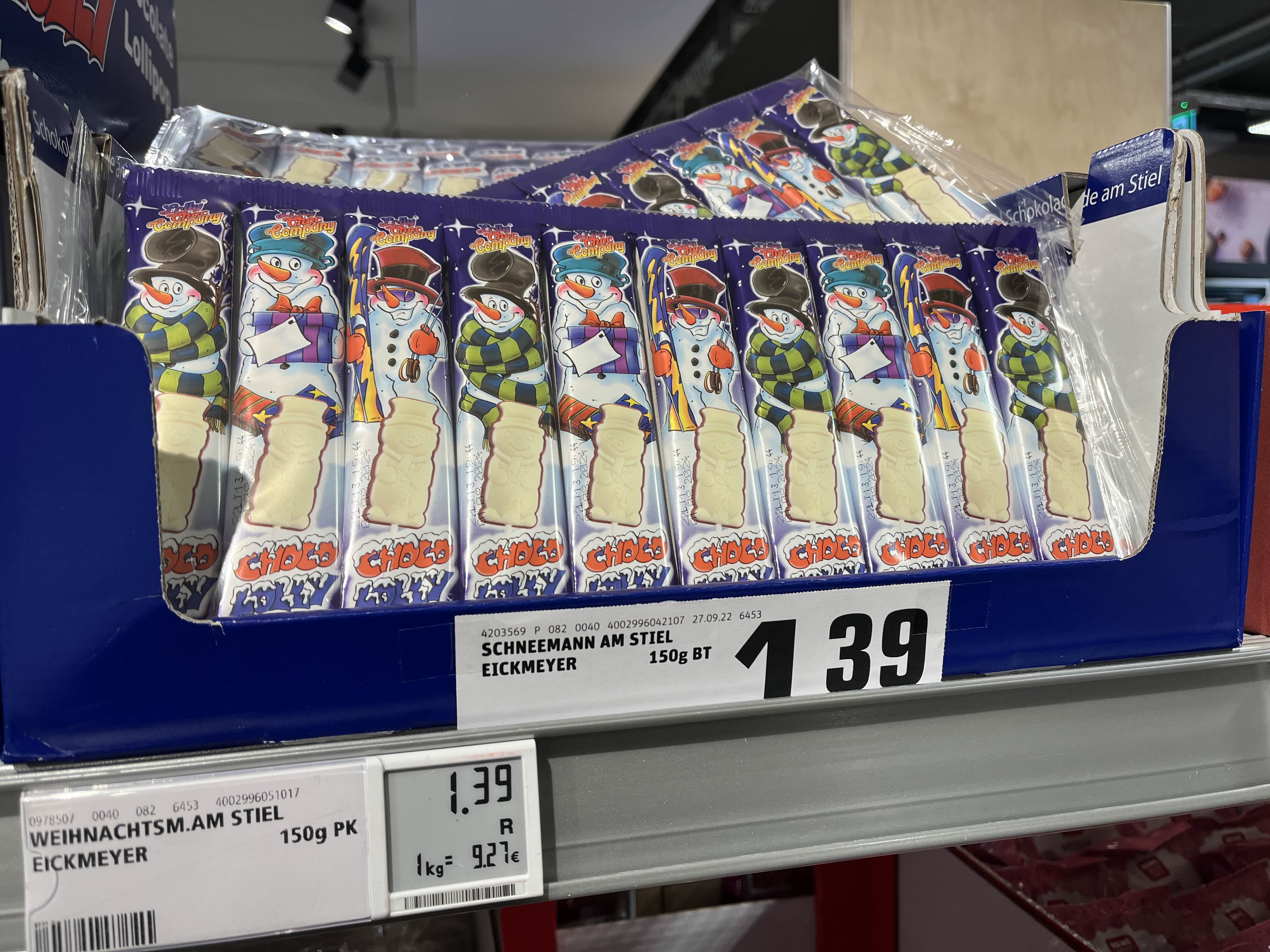 눈사람 모양 막대로 있는 초코렛인데 하나씩 나눠주기 좋다.