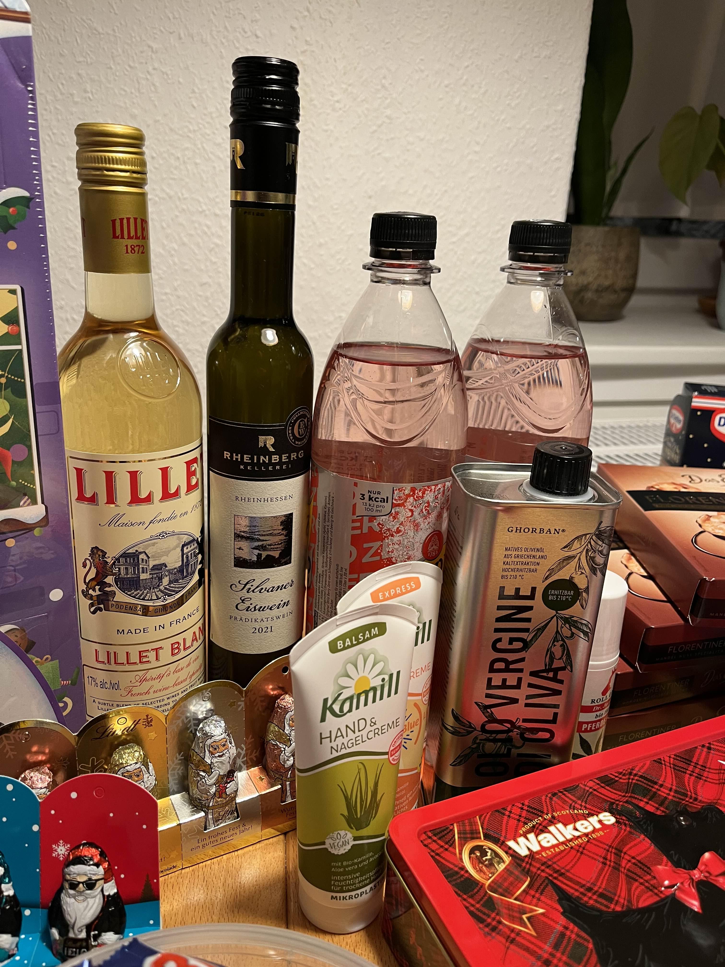 사실 작년에 좋은 럼과 와인을 몇 병 가져갔는데 인기가 별로 였다. 그래서 이번엔 내가 좋아하는 달달한 술 위주로 가져갔다. 와일드 베리랑 섞어먹는 Lillet 이랑 아이스와인인데, 며칠 전 이마트에 가니까 아이스와인 종류도 많고 싸게 팔더라 🥲 아이스와인 말고 다른 걸 가져오는 걸 추천하고 Lillet은 보니까 나는 13유로인가 주고 샀는데 한국에서는 거의 6만 원하길래 잘 가져왔다 싶었다. Lillet만 가져오기보다는 수하물에 자리가 남는다면 같이 섞어먹는 와일드베리(아이스 와인 옆 붉은색 음료 2 병)도 같이 가져오는 걸 추천한다. Lillet은 이거랑 타 먹어야 하는데 한국에는 이거랑 비슷한 건 아직 못 찾았다. 핸드크림은 독일에서는 진짜 저렴하니까 그냥 몇 개 가져왔고 올리브 오일도 괜찮아 보이는 걸로 하나 가져왔다. 좋은 올리브 오일은 빵 찍어먹거나 샐러드로 먹어야 그 맛을 느낄 수 있는데… 가족들이 빵도 샐러드도 잘 안 먹어서 이 올리브 오일은 아마 감바스 하는데 쓰이지 않을까 싶다 🥹