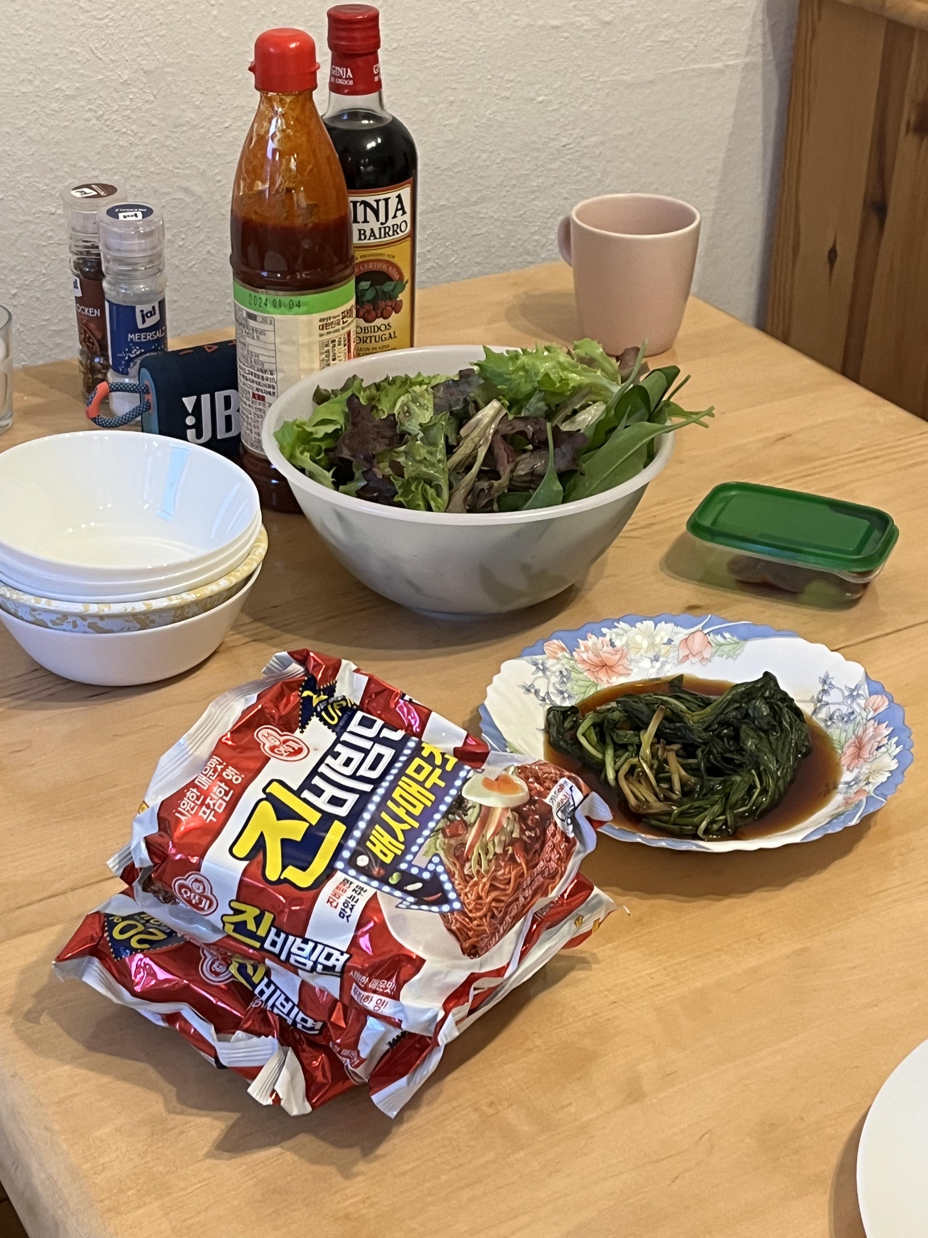 명이 쌈 싸 먹었다는 걸 보여주려고 올렸는데 진비빔면이 주인공 같다;; 친구 덕분에 배사매무초 처음 먹어봤는데 맛있더라. 이건 명이 사냥 이후 먹은 저녁은 아니고 다음날 저녁이다. 당일은 이미 명이를 캐느라 지쳤기 때문에 외식을 했고 다음날 명이랑 삼겹살이랑 같이 먹으려고 모였다.