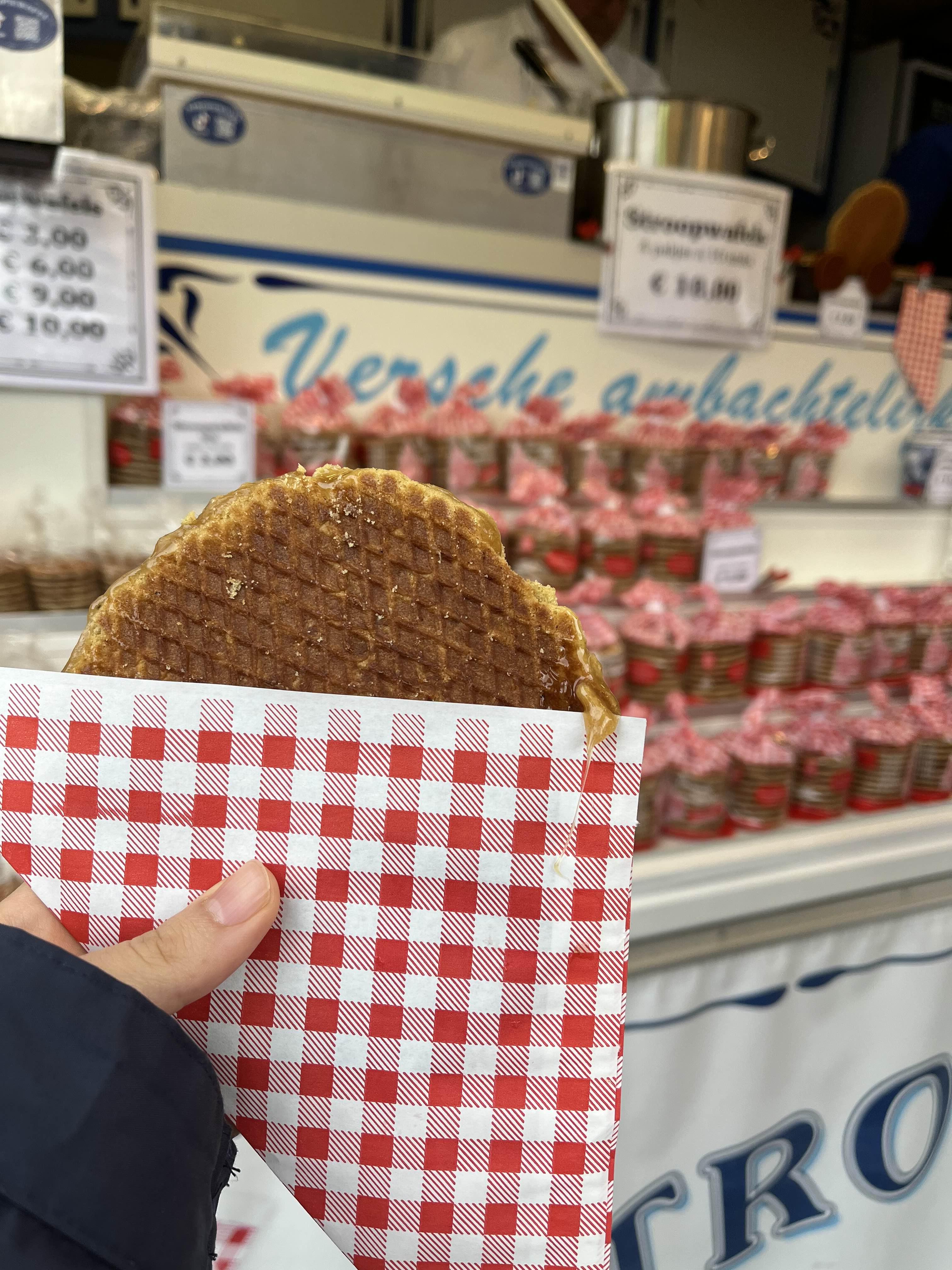 네덜란드에 왔으면 당연히 먹어줘야 하는 스트룹와플!!!!! 마켓에서는 갓 만든 따끈한 와플을 먹을 수 있다. 마트에서 파는 거랑 다르게 크기도 좀 크고 따끈따끈해서 엄청 맛있다. 포장된 것도 친구들 주려고 몇 개 사 왔는데 너무 맛있더라.