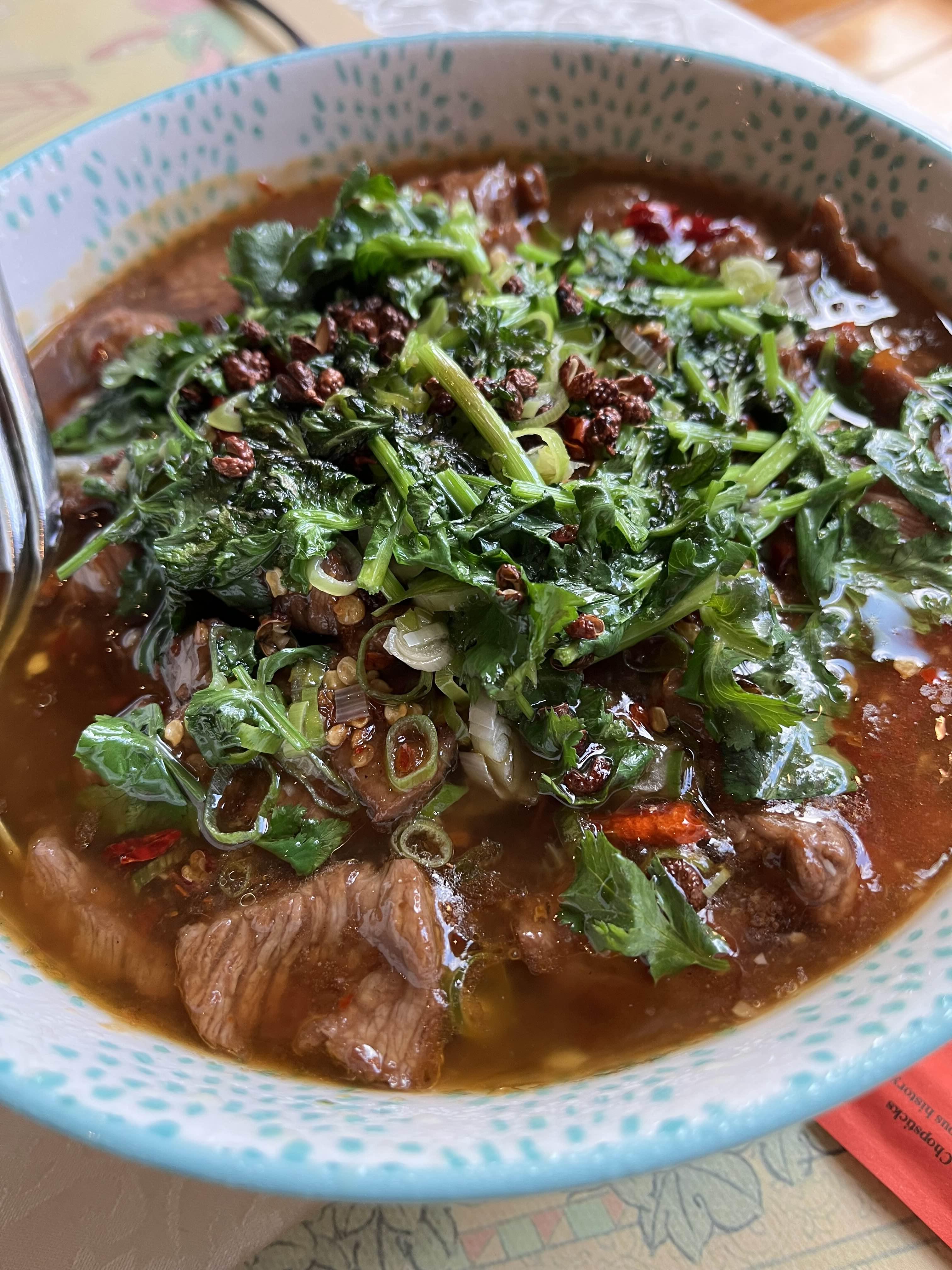 저녁 먹으러 일찍 오기도 했고 식당에 우리밖에 없어서 요리가 엄청 빨리 나왔다. 근데 이거 위에 올려진 거 뭐야!!!! 고수가 올라갈 줄은 몰랐는데 🥹 다 건져내고 먹느라 고생했다. 고수맛이 간간히 났지만 그래도 너무 맛있었다. 매워보인느데 하나도 안 맵고 맛있더라.