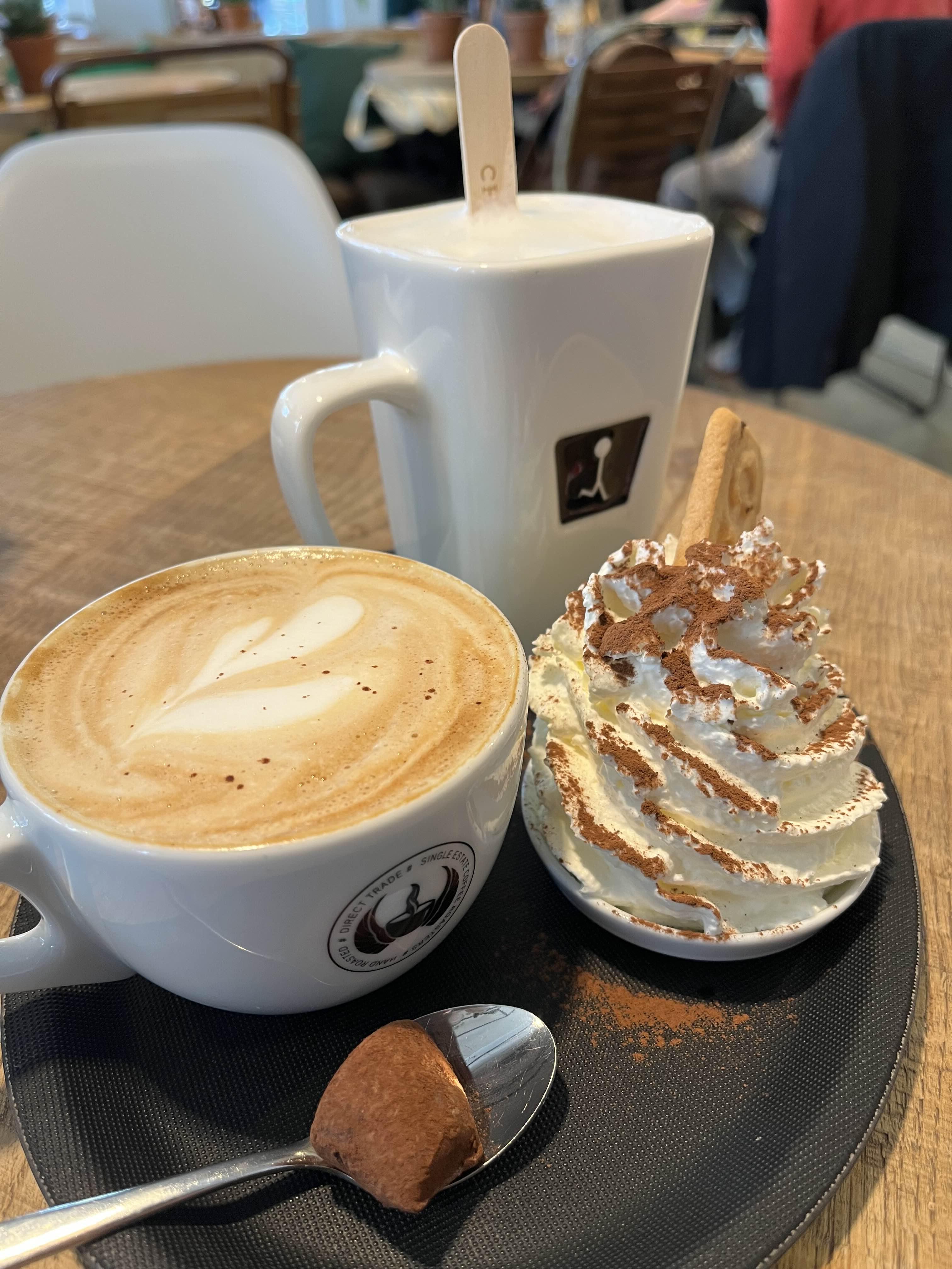 초콜릿 컴퍼니라고 적혀있길래 잘됐다 싶어서 들어왔는데 진짜 제대로 초콜릿 어쩌고 저쩌구들을 팔고 있었다. 친구는 카푸치노를 시키고 나는 핫초코를 시켜달라고 했는데 무슨 핫초코를 시키면 종류를 고를 수 있더라. 초콜릿바가 카운터에 진열되어 있고 그중에 하나를 고르면 스팀밀크에다가 그 핫초코 바를 꽂아주고 그걸 녹여서 핫초코로 해서 먹는 식이었다. 아주 신기한데?? 그래서 저 사진에 보이는 아이스크림 막대 같은 거에 초콜릿이 있고 녹는 중이다. 카페 분위기도 좋고 커피도 맛있어서 편히 쉰 다음에 다시 구경하러 나왔다.