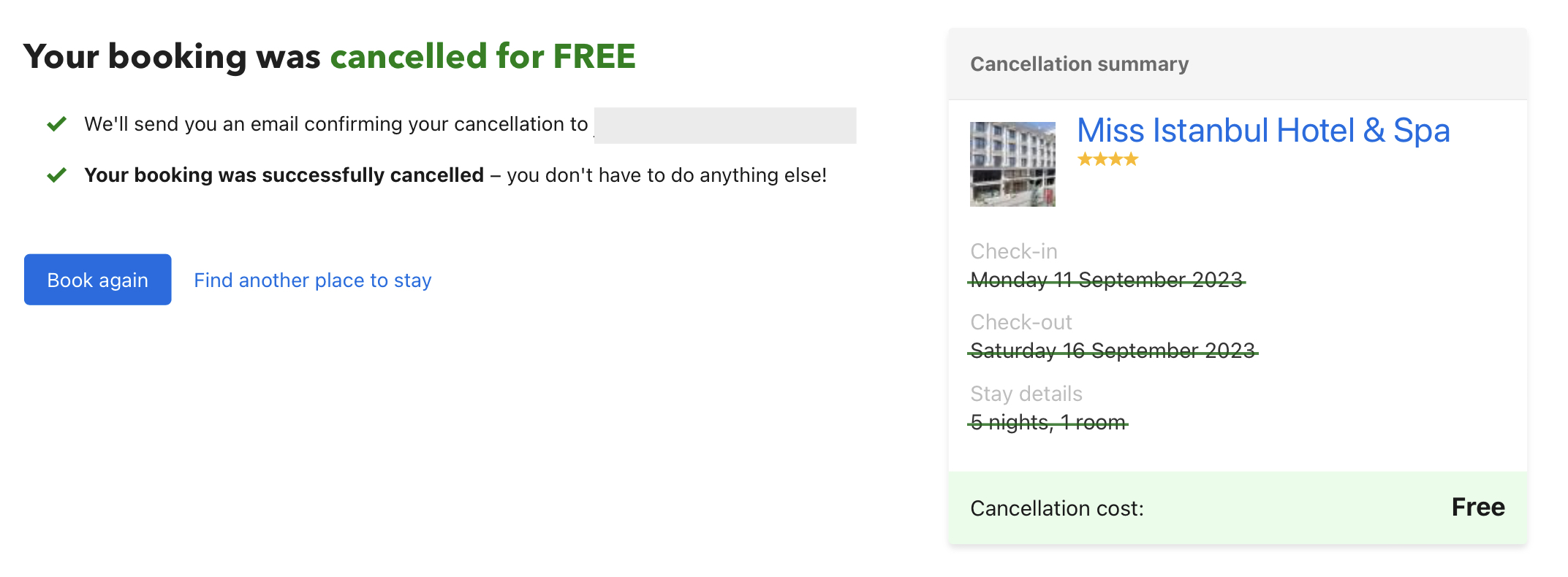 대ㅐㅐㅐㅐㅐ박!!!! 어떻게 전화를 받은 그날이 딱 마지막 날일수가 있지? 그리고 취소 불가능한 옵션인데도 체크인 4주 넘게 남았으면 취소가 되는 거였잖아???? 전혀 몰랐네 아무튼 취소 불가 옵션으로 예약한 호텔이었는데 체크인까지 4주 넘게 남은 덕분에 부킹닷컴 통해서 무료로 취소할 수 있었다 🎉