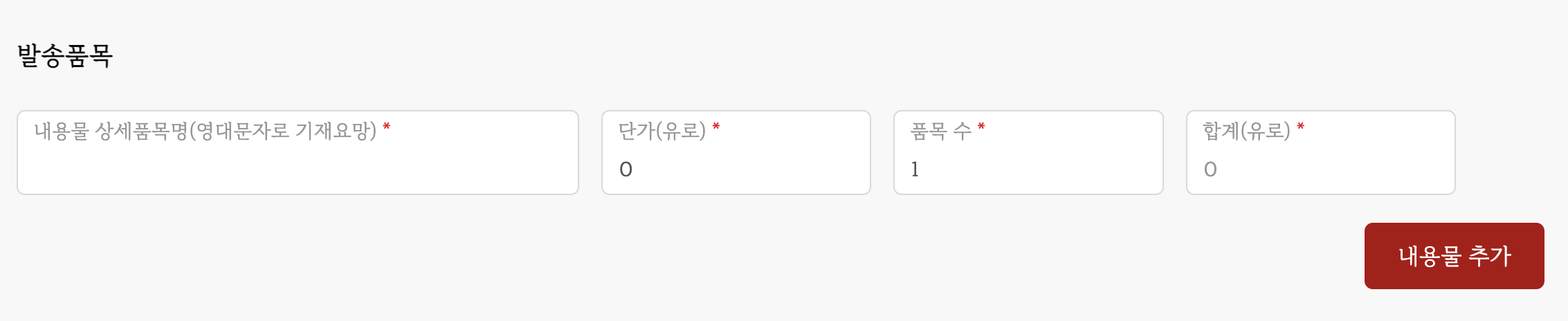 수취인, 개인통관부호, 주소를 적고 나면 밑에 발송품목이 있는데 예전 엑셀로 적던 것과는 다르게 엄청 쉬워졌다. 입었던 옷을 보내는 거라 내 경우에는 [USED CLOTHES]를 적고 단가는 1유로로 적었다. 한 번도 분실된 적 없기 때문에... 분실 걱정은 하지 않는다 🙄 적고 맨 밑에 [신청서 제출] 버튼을 누르면 끝이다. 엑셀로 적어서 파일 보내고 했던 것과 다르게 홈페이지가 생기니까 훨씬 편하게 보낼 수 있다.