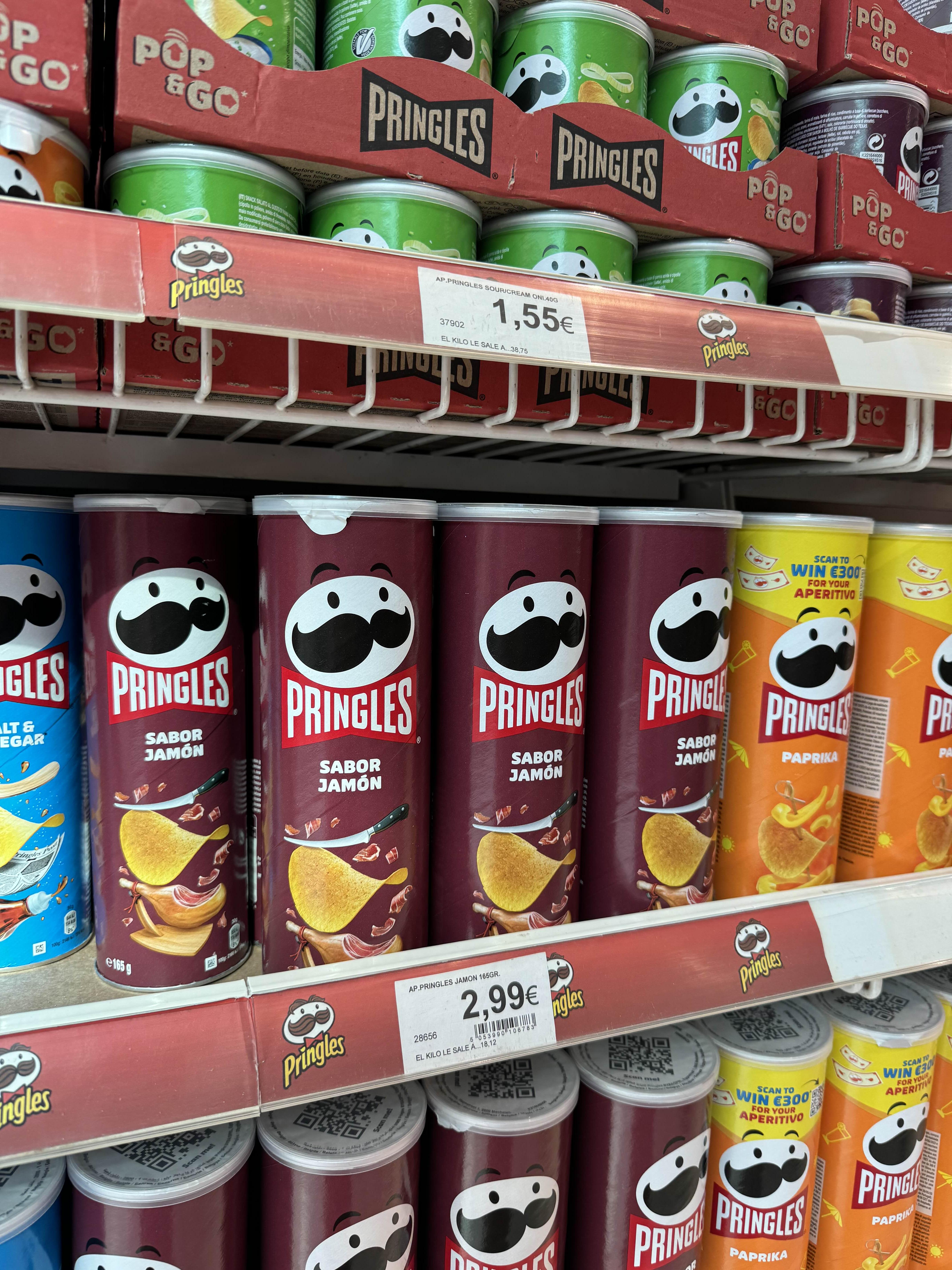 프링글스 하몽맛~~~~~ 신기해서 먹어봤는데 이게 하몽맛이라고 싶은 맛이다. 하몽까지는 모르겠고 맛있는 바베큐 맛! 그래도 스페인에 간 기념으로 몇 개 사왔다.