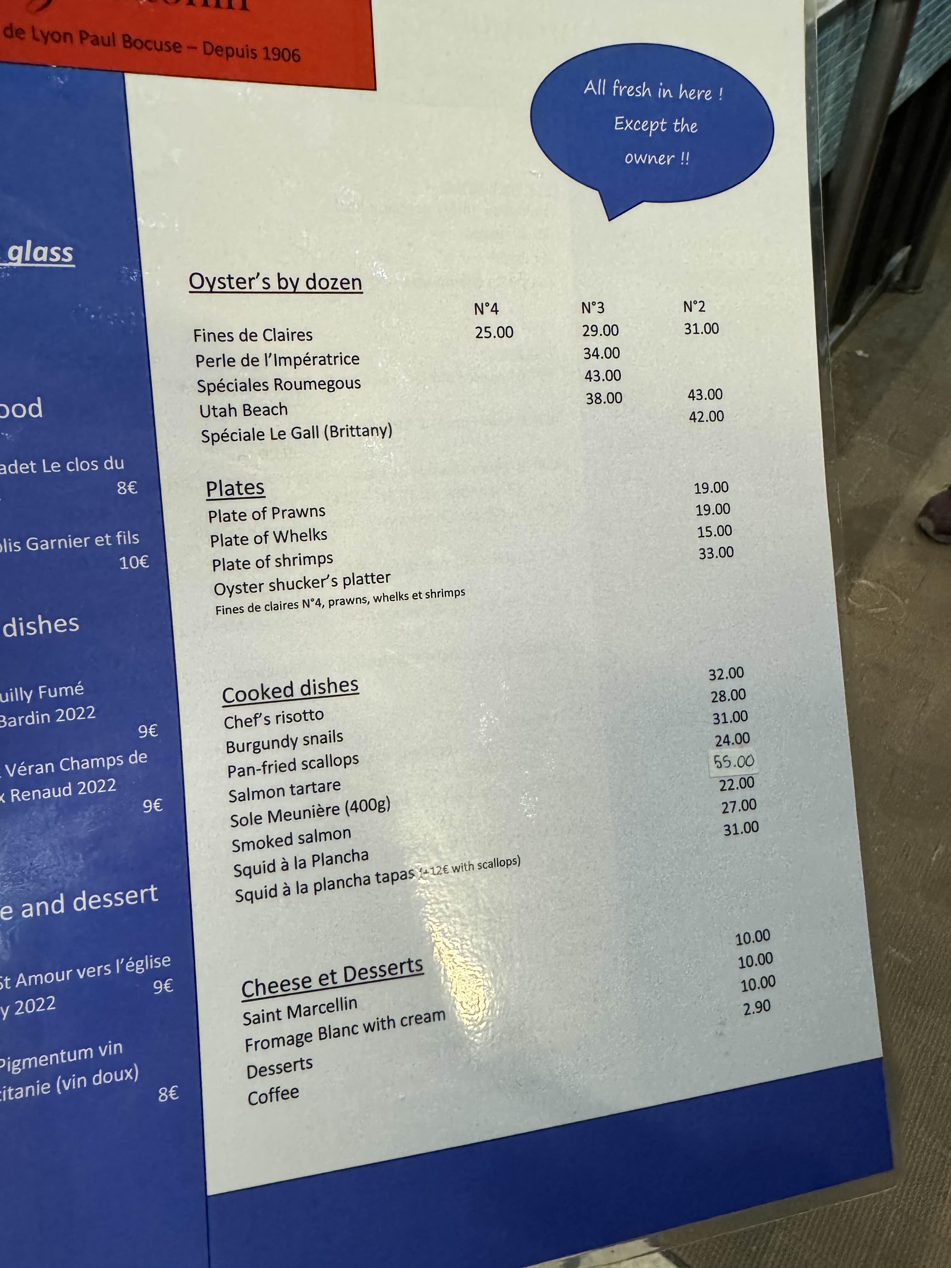 굴 파는 가게가 엄청 많은데 다 똑같이 생겨가지고 어버버 하고 있다가 한 군데 자리 잡았다. 불어를 못 하면 굉장히 불친절하게 대할 거라는 걱정과는 다르게 영어로 주문해도 되냐고 하니까 영어로 된 메뉴판도 줬다. 마켓에 있는 다른 식당도 비슷하게 다 12개가 기본이었고 N°4는 크기를 말한다. 숫자가 작을수록 크기가 큰 굴이다. 매번 주문하던 것처럼 제일 저렴한 것도 제일 비싼 거도 아닌 어중간한 것 중에서 사이즈도 중간으로 Perle de I’lmpértrice N°3으로 주문했다. 12개에 34유로니까 굴 하나에 2.8유로다. 이 정도면 괜찮은 거 같은데??? 물론 한국에 살다가 프랑스 여행하는 거라면 굴은 거들떠도 안 보겠지만 나는 독일에 살기 때문에… 굴이 너무 간절했다 😭