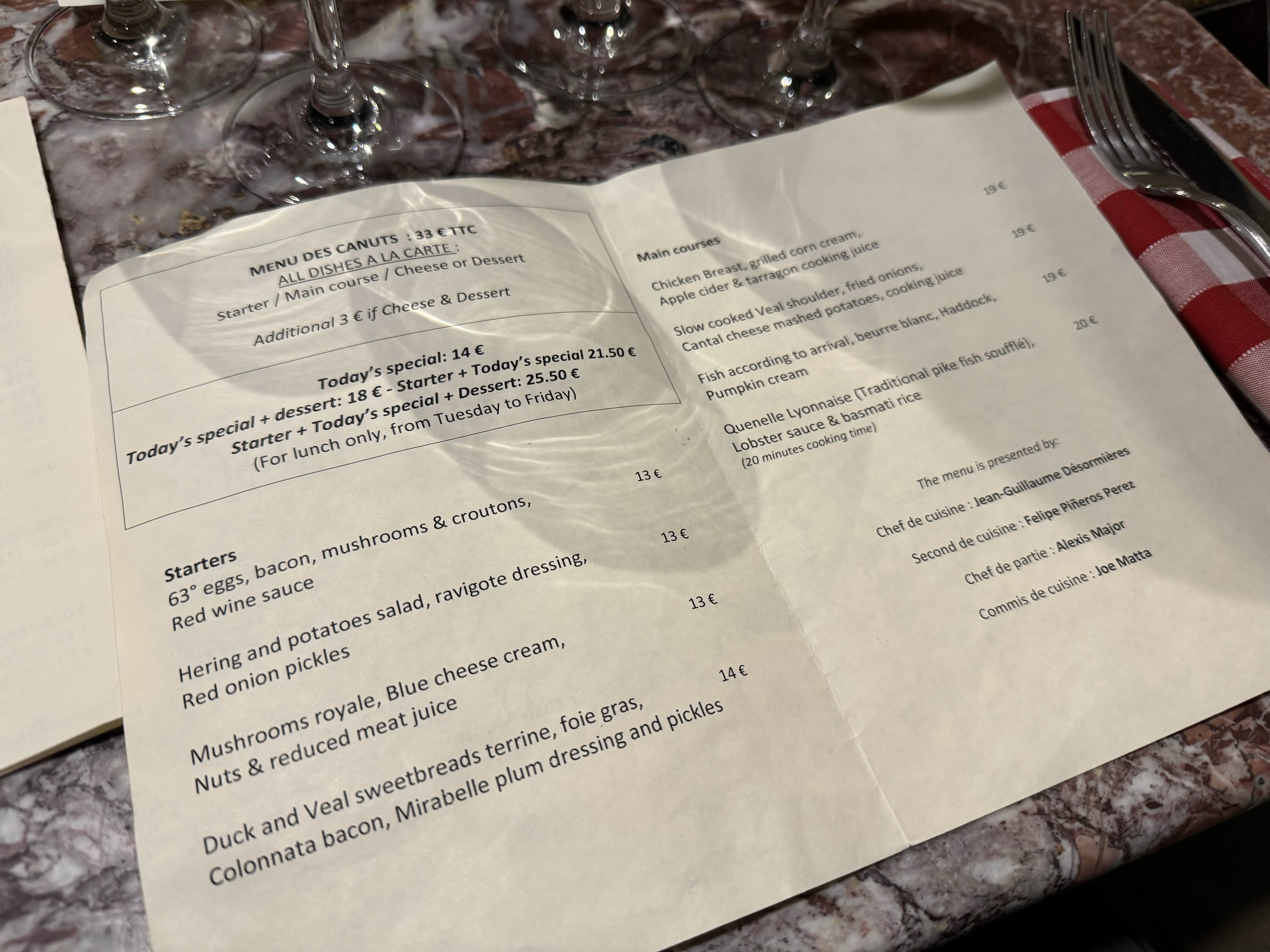 프랑스 음식!! 리옹!! 프랑스 음식 제대로 먹어본 건 이때가 처음인 것 같다. 사실 리옹 여행에 대해 전반적으로 별 기대가 없었다. 그래서 식당도 열심히 찾아본 게 아니고 좋아 보이네 하고 그냥 예약한 거라 기대 안 했는데 너무 귀엽고 분위기도 좋아서 신났다. 영어로 주문할 수 있냐고 하니까 여기도 영어 메뉴판을 가져다줬다.