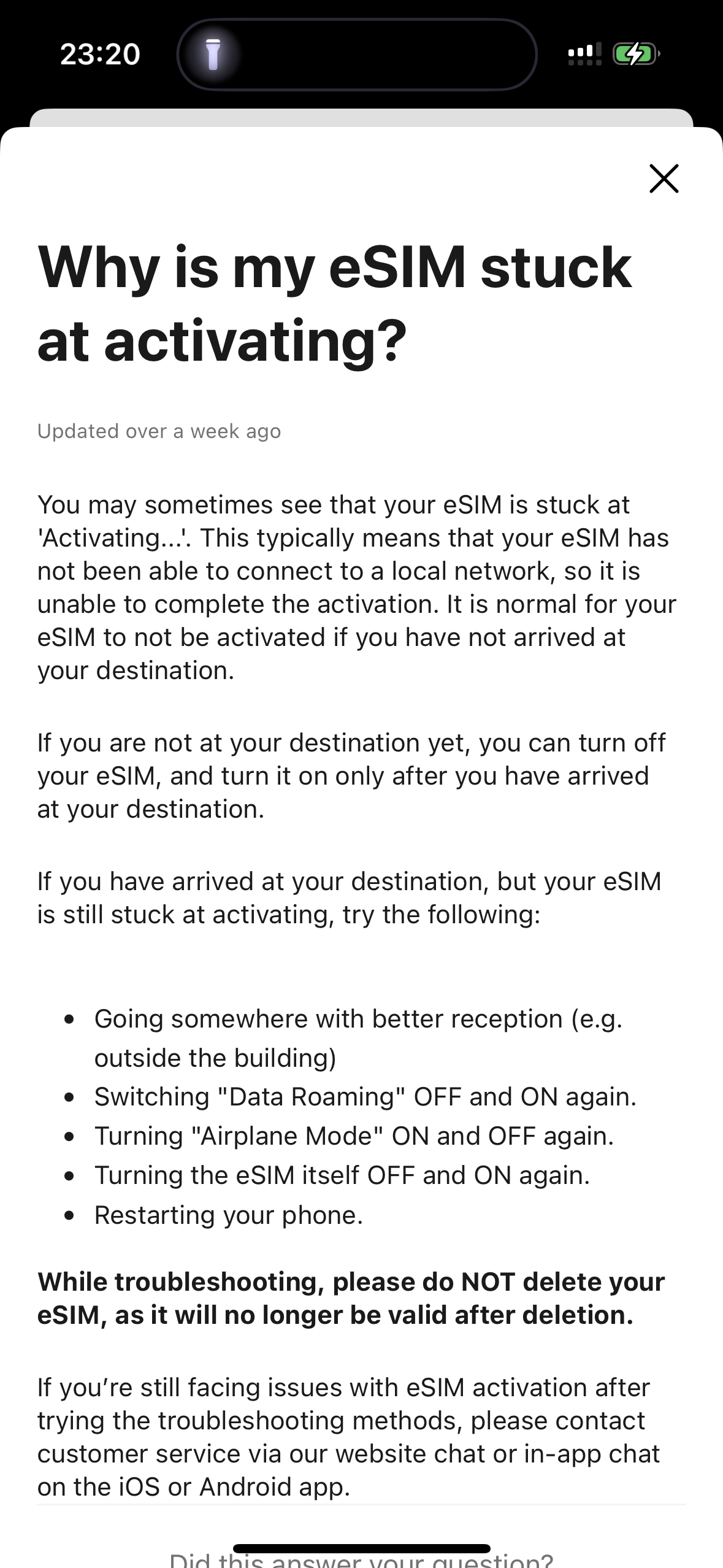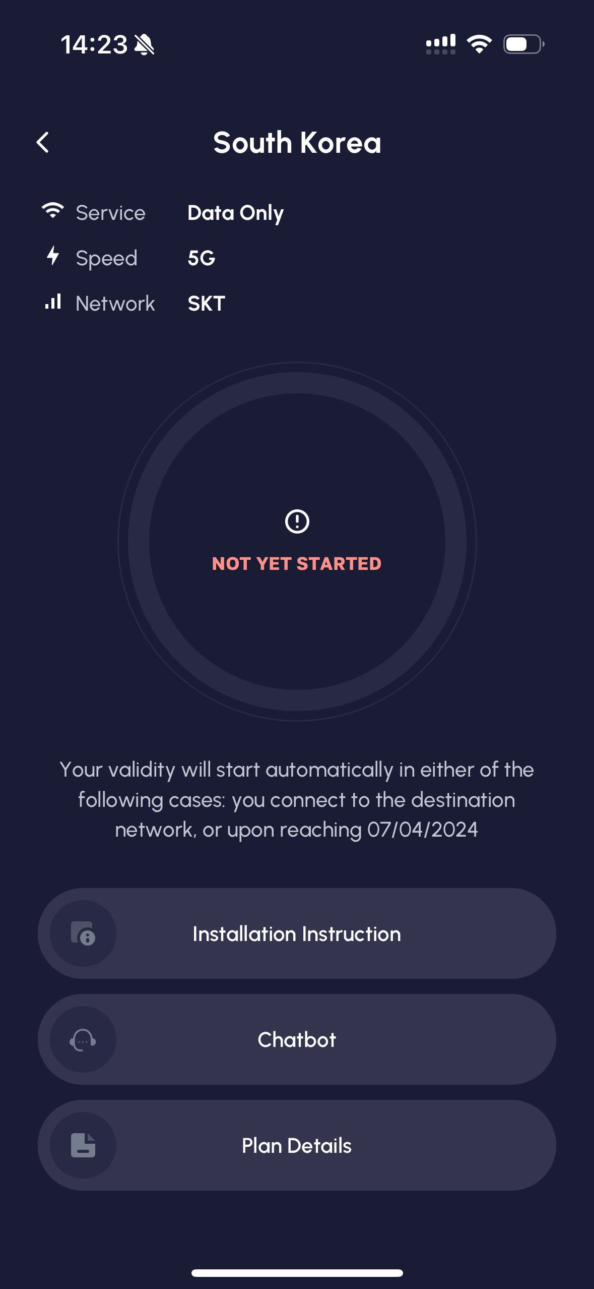 설치가 끝나면 앱 내에는 이렇게 보인다. 아직 내 휴대폰 환경설정에서 eSIM 카드를 활성화시키지 않았기 때문에 앱에서도 활성화 안 됐다고 뜬다. 쓸 일은 없었지만 Chatbot도 있어서 문제가 생기면 바로 문의 넣기 편해 보인다.
