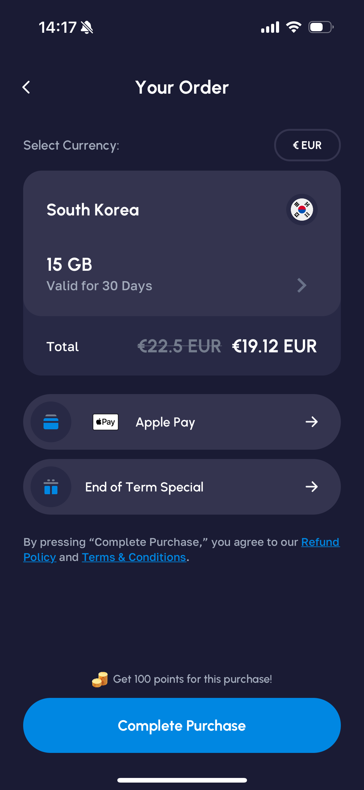 재구매다 보니 이전 구매에서 쌓인 포인트까지 쓰니까 18.78유로까지 할인!!! 이전에 썼던 eSIM은 어차피 기간이 지나서 다시 충전 못 하기 때문에 지워주고 새로운 eSIM으로 구매했다.