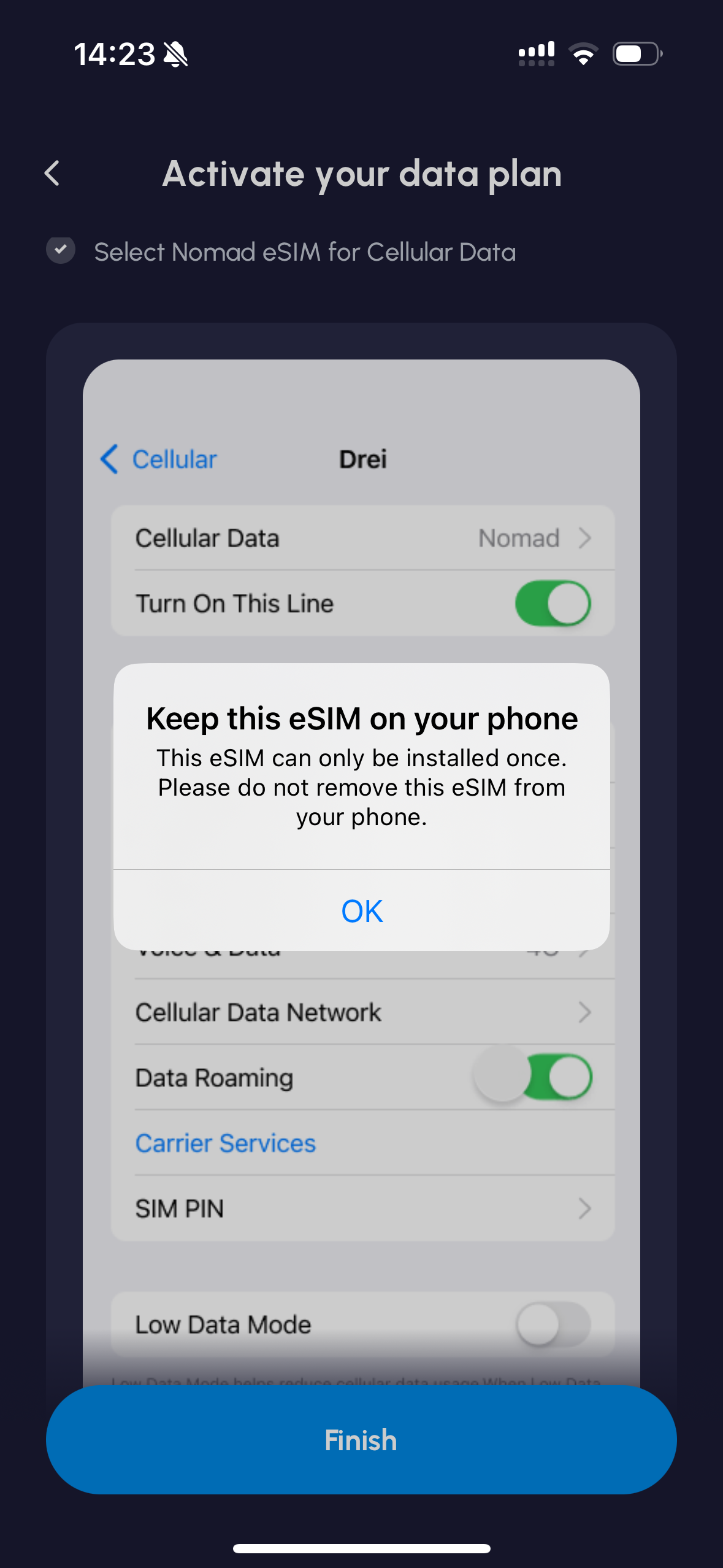 설치 후 환경 설정에 들어가서 모바일 서비스를 들어가면 이렇게 SIMs에 Nomad 심카드가 생긴걸 볼 수 있다. 번호는 없는 데이터 전용이라서 No Number, 그리고 아직 활성화를 해주기 전 상태이기 때문에 'Off'로 해놨다. 한국에 갔을 때 이걸 'On'으로 바꿔주고 위에 Mobile Data를 Nomad 심카드로 바꿔주면 끝이다.
