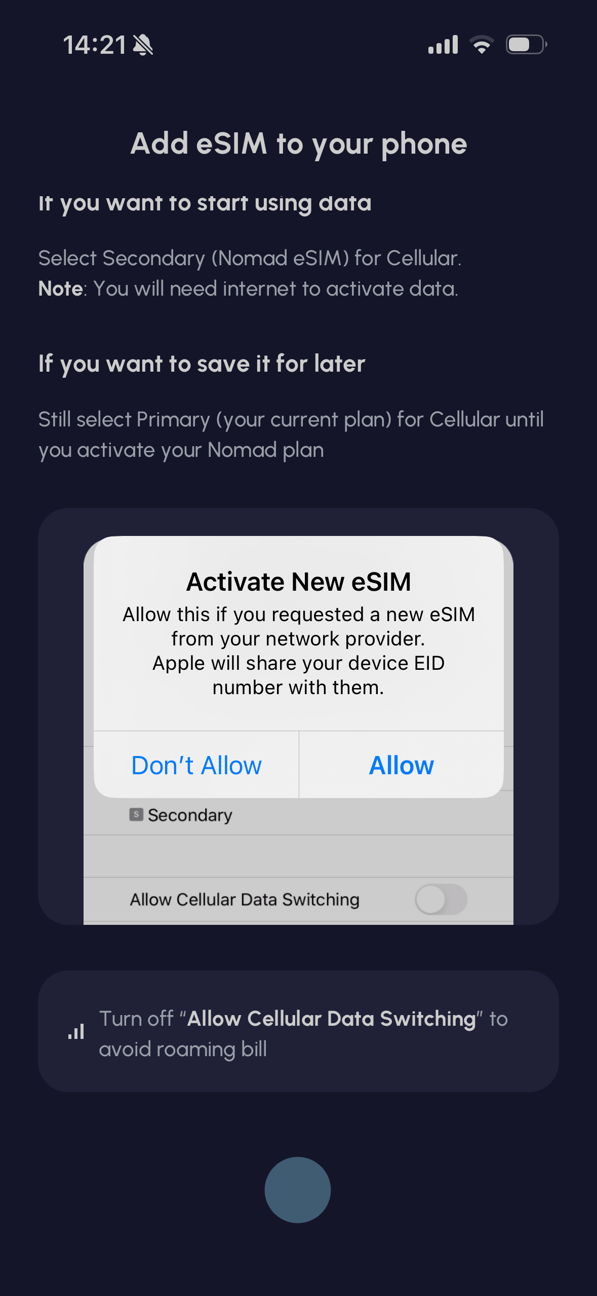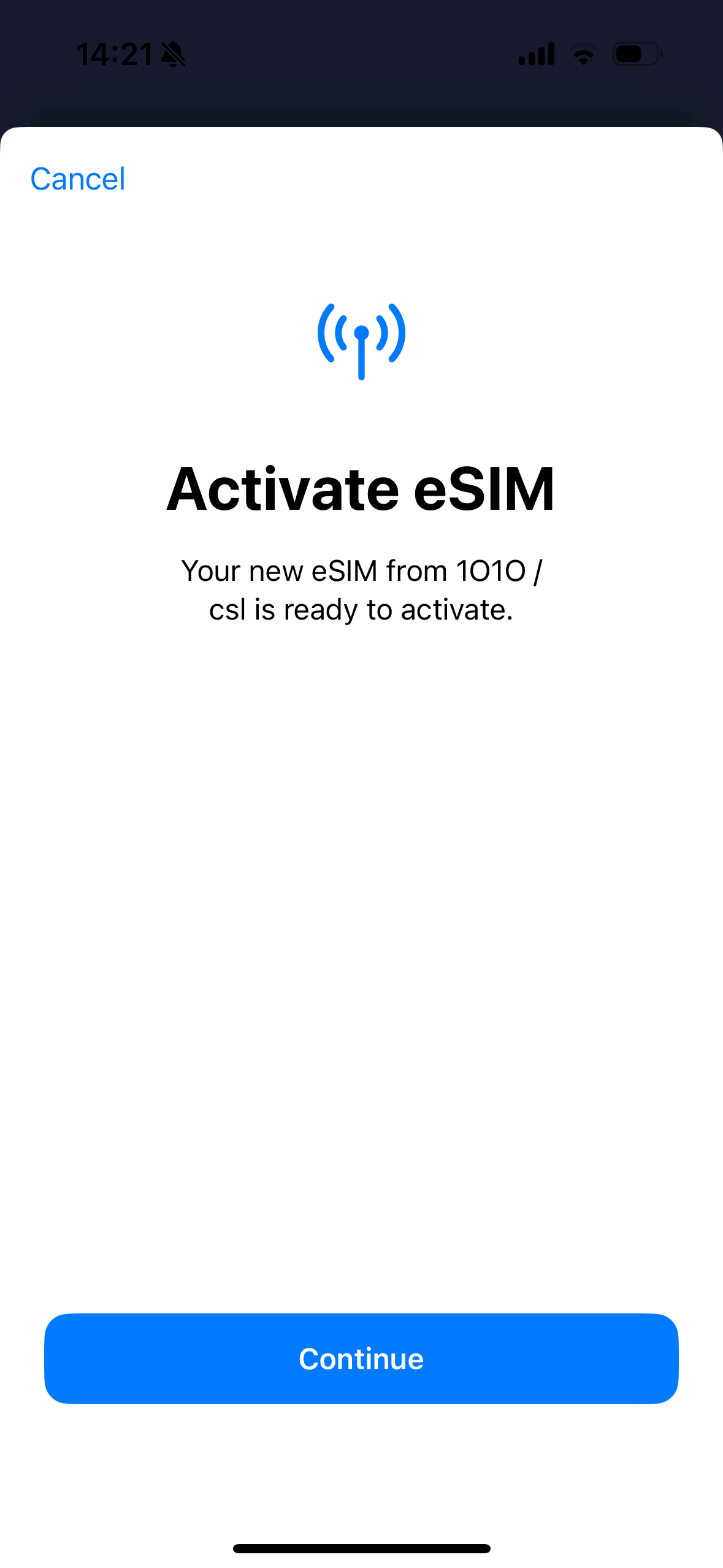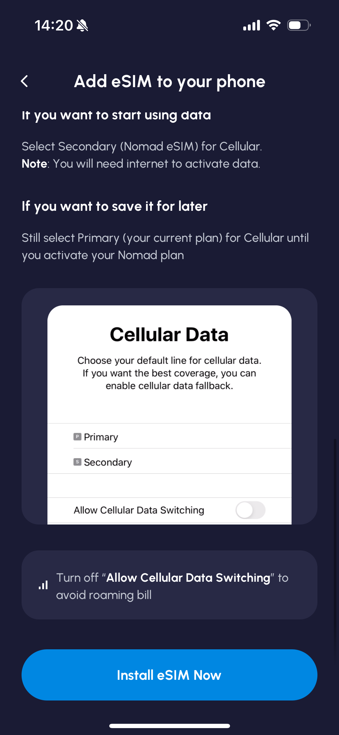한 번도 eSIM을 설치해 본 적 없어서 쫄았는데 별 거 없더라. [Install eSIM Now] 버튼을 누르면 오른쪽처럼 시스템 팝업창이 뜨면서 설치를 허락할 건지 물어본다.