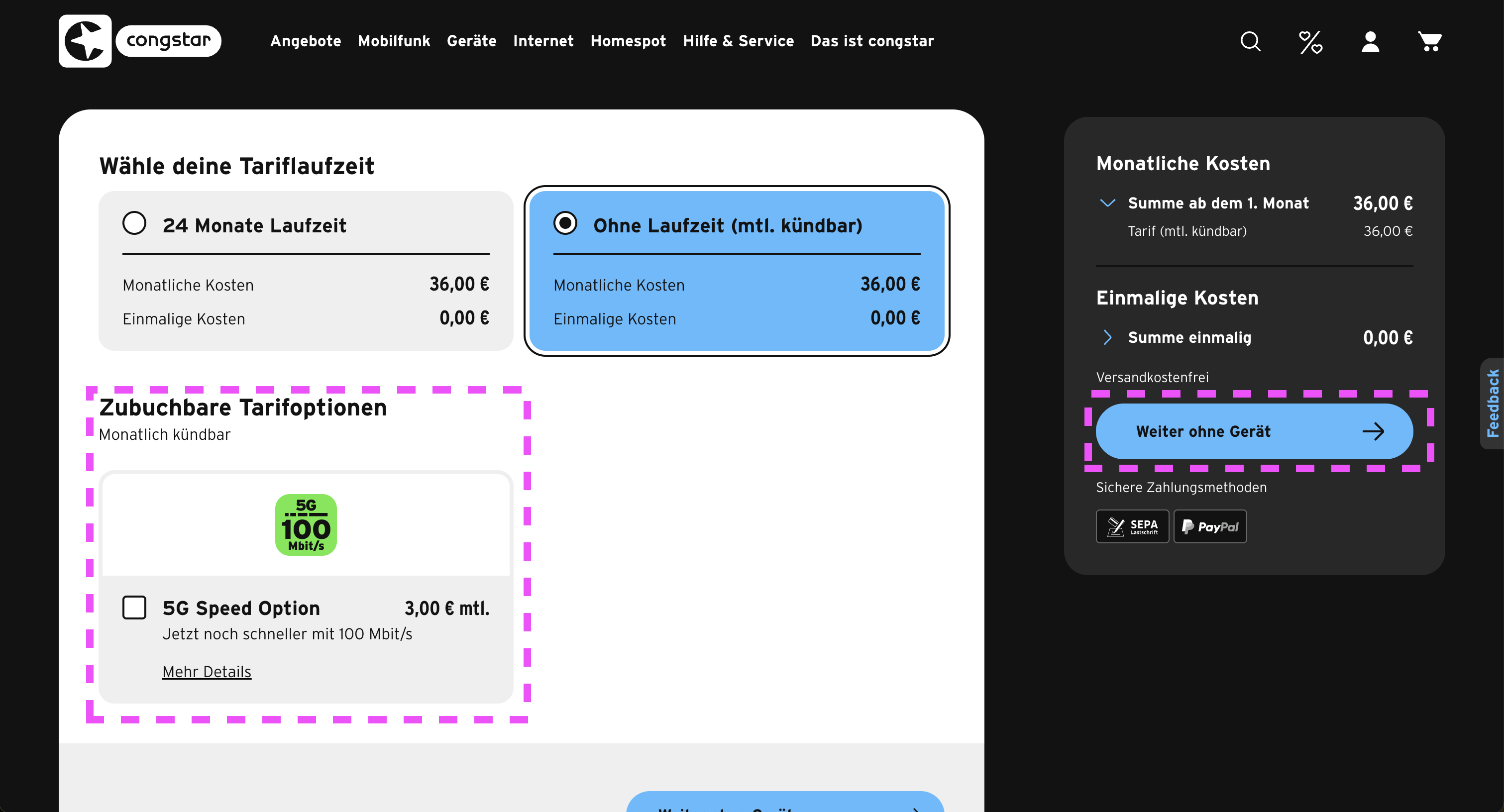 요금제를 선택하면 이렇게 최소 계약 기간이 있는 거랑 매월 해지 가능한 옵션이 뜬다. 왜인지 모르겠지만 둘의 가격이 똑같다. 나는 무슨 가입비도 35유로 있었는데 지금은 1월 6일까지 가입비도 없는 이벤트를 하고 있다고 한다. 아무튼 그런 거 다 없고 동일한 가격이니 혹시 몰라서 나는 매월 해지 가능한 옵션으로 5G까지 되는 걸로 신청했다.