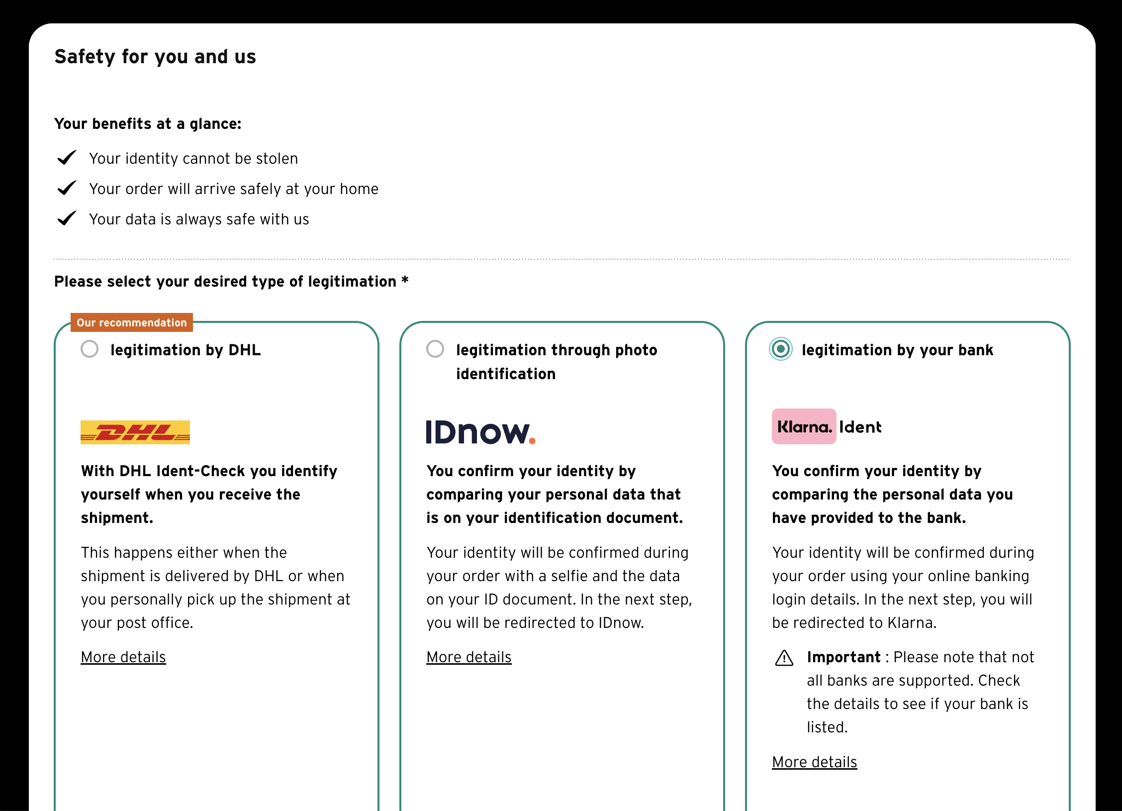이렇게 세 가지 옵션이 있는데 편한 옵션으로 하면 된다. 본인은 신청 당시 한국이었기 때문에 DHL은 안 됐고 IDnow나 Klarna로 했던 거 같다.