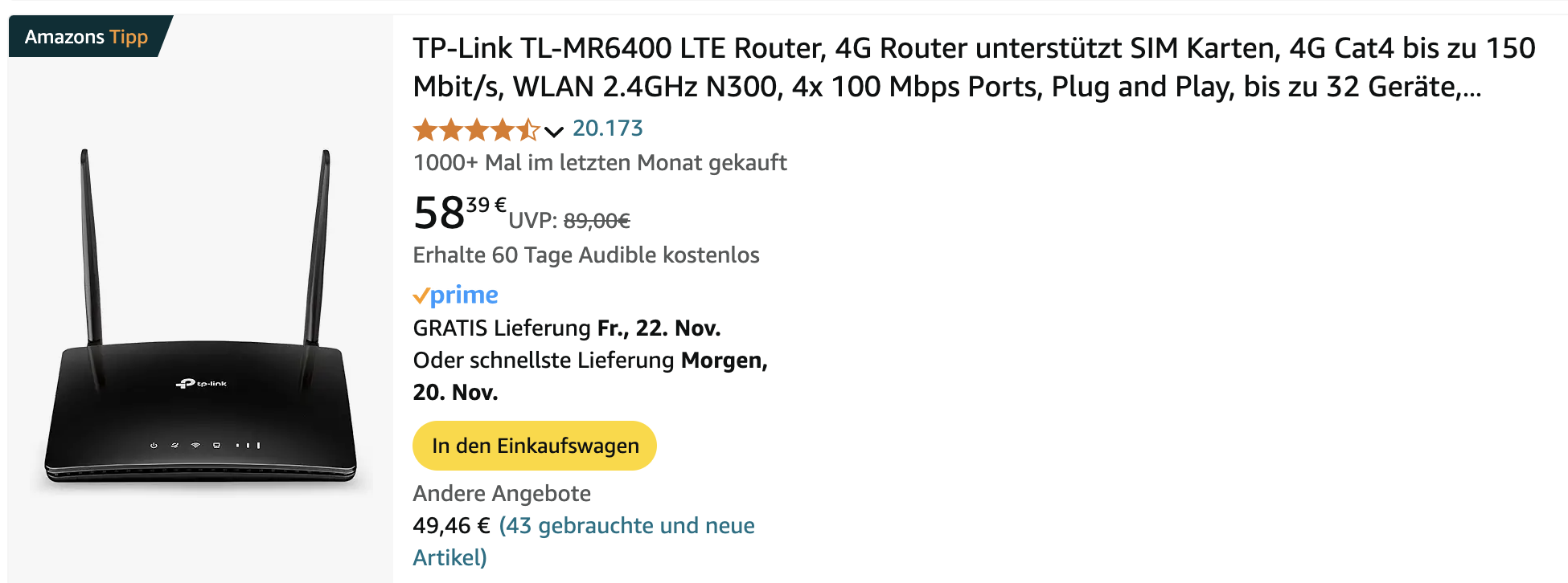 보니까 TP-Link TL-MR6400는 5 GHz가 지원이 안 되길래 TP-Link Archer MR200를 구매했다. 아마존이나 Saturn, MediaMarkt에서 구매할 수 있는데 결론은 이거 말고 FRITZ!Box를 샀다.