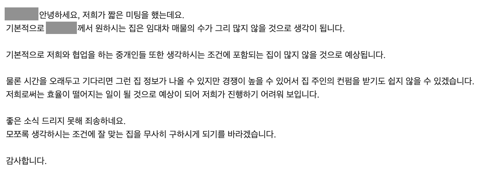 실제로 나는 이런 식으로 접근한 이후에 이전보다 더 많은 오퍼를 받을 수 있었다. 지인의 경우에는 매번 “가족이 살기 좋아 보여요”라고만 이야기했을 때는 큰 반응이 없었는데, 아이들과 함께 집 방문을 했을 때 훨씬 좋은 인상을 주었고, 결국 그 집에서 오퍼를 받아 계약까지 이어졌다고 한다.