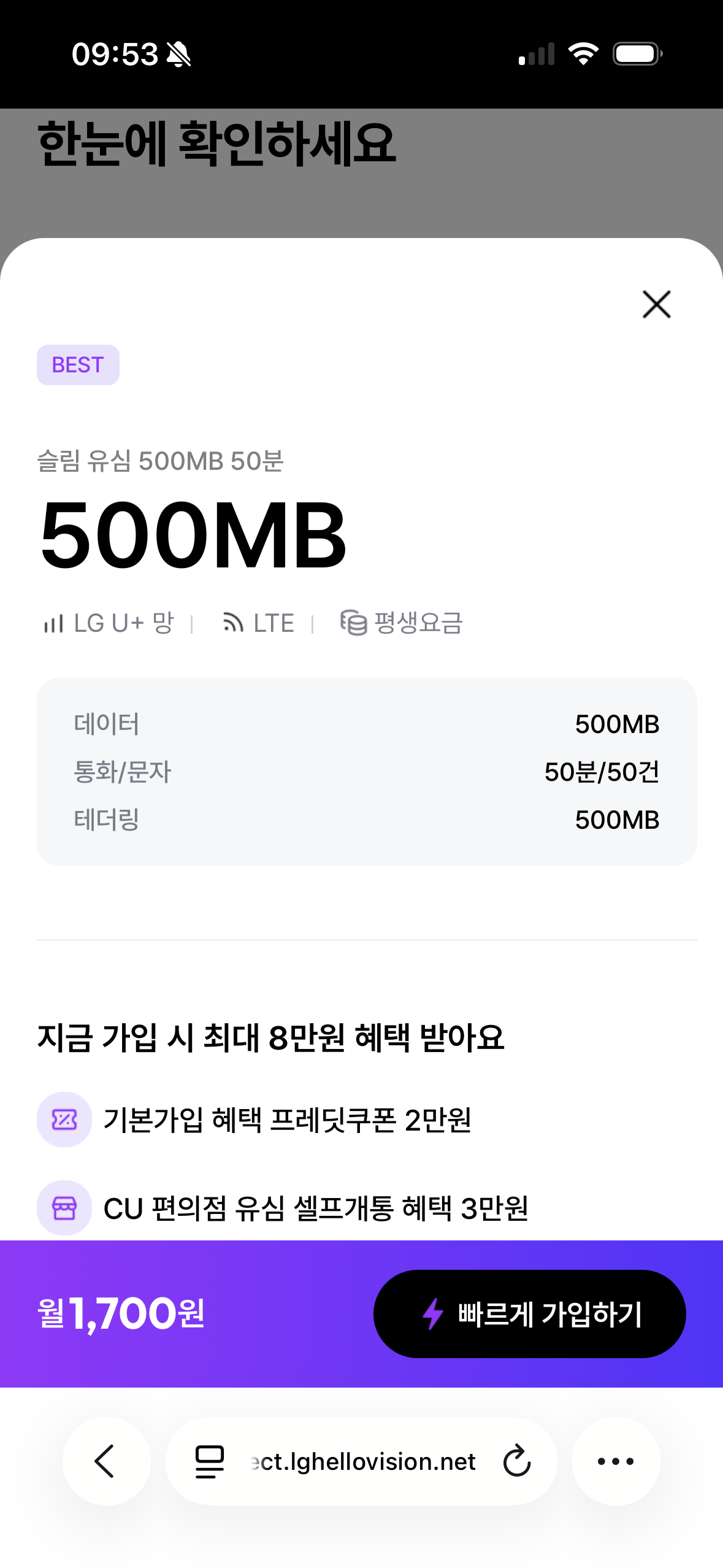 바로 LG헬로 모바일의 슬림 유심 500MB 50분 요금제. 평생 요금이라고 적혀있어서 다른 요금제처럼 6개월, 1년 뒤에 다시 비싸지는 게 아니고 그냥 계속 월 1700원이다. 이심(eSIM)으로 번호 이동, 셀프 개통도 가능했다.